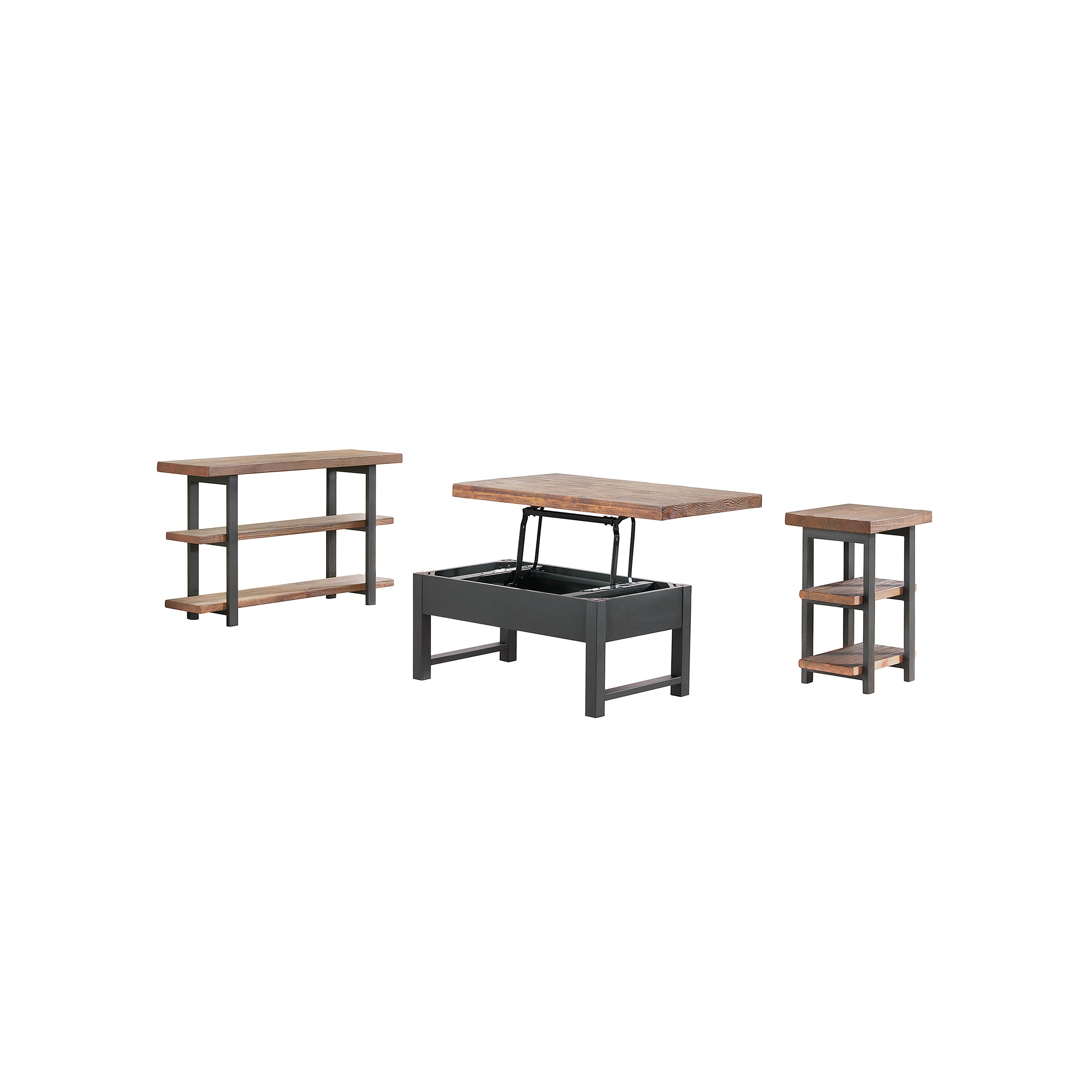 The Pomona collection features the exquisite workmanship of a solid wood top with metal legs that will last for years to come. Each piece is constructed of solid pine wood and finished to have the appearance of reclaimed wood. The reclaimed wood finish highlights natural wood variations such as cracks and knots which add to the piece's character. This set of four is sure to enhance your living room style; one lift top coffee table, sofa/TV console and two end tables complete the look. Any item in this collection will add to the rustic industrial style of any space.