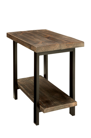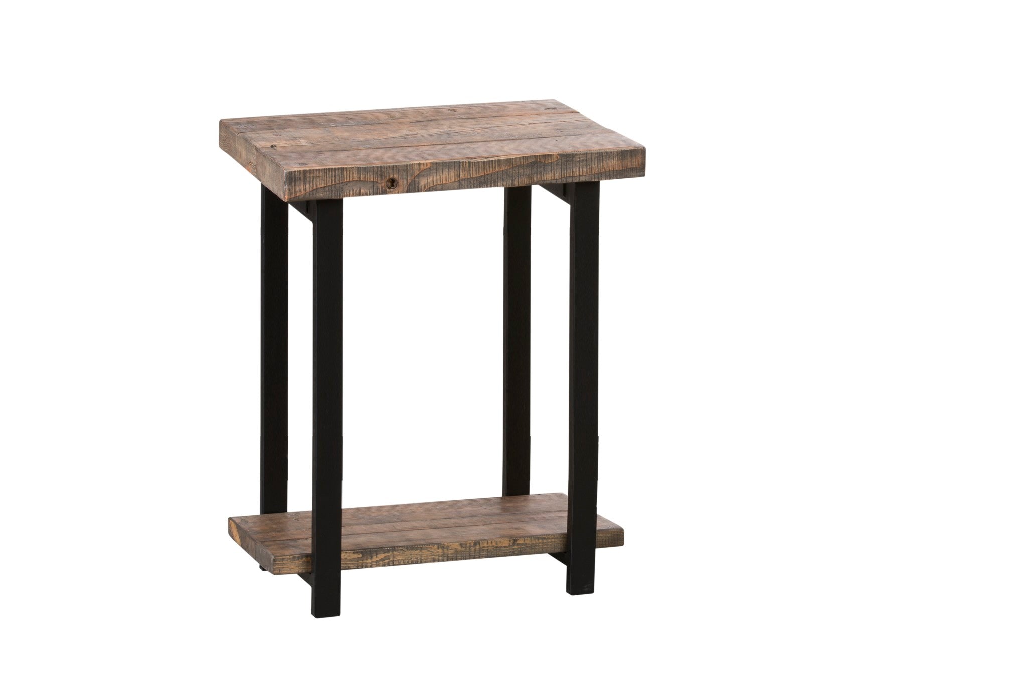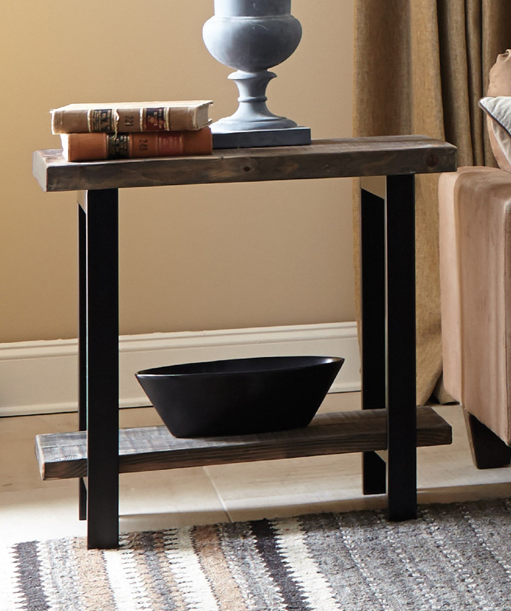 The Pomona collection features the exquisite workmanship of a solid wood top with metal legs that will last for years to come. Each piece is constructed of solid pine wood and finished to have the appearance of reclaimed wood. The reclaimed wood finish highlights natural wood variations such as cracks and knots which add to the piece's character. Any item in this collection will add to the rustic industrial style of any space. Pomona 2-tier end table will add warmth to any décor. The rustic natural finish and design provide a stylish element to your room. Add your favorite lamp, books, magazines, or knick knack to complete your decorating style.