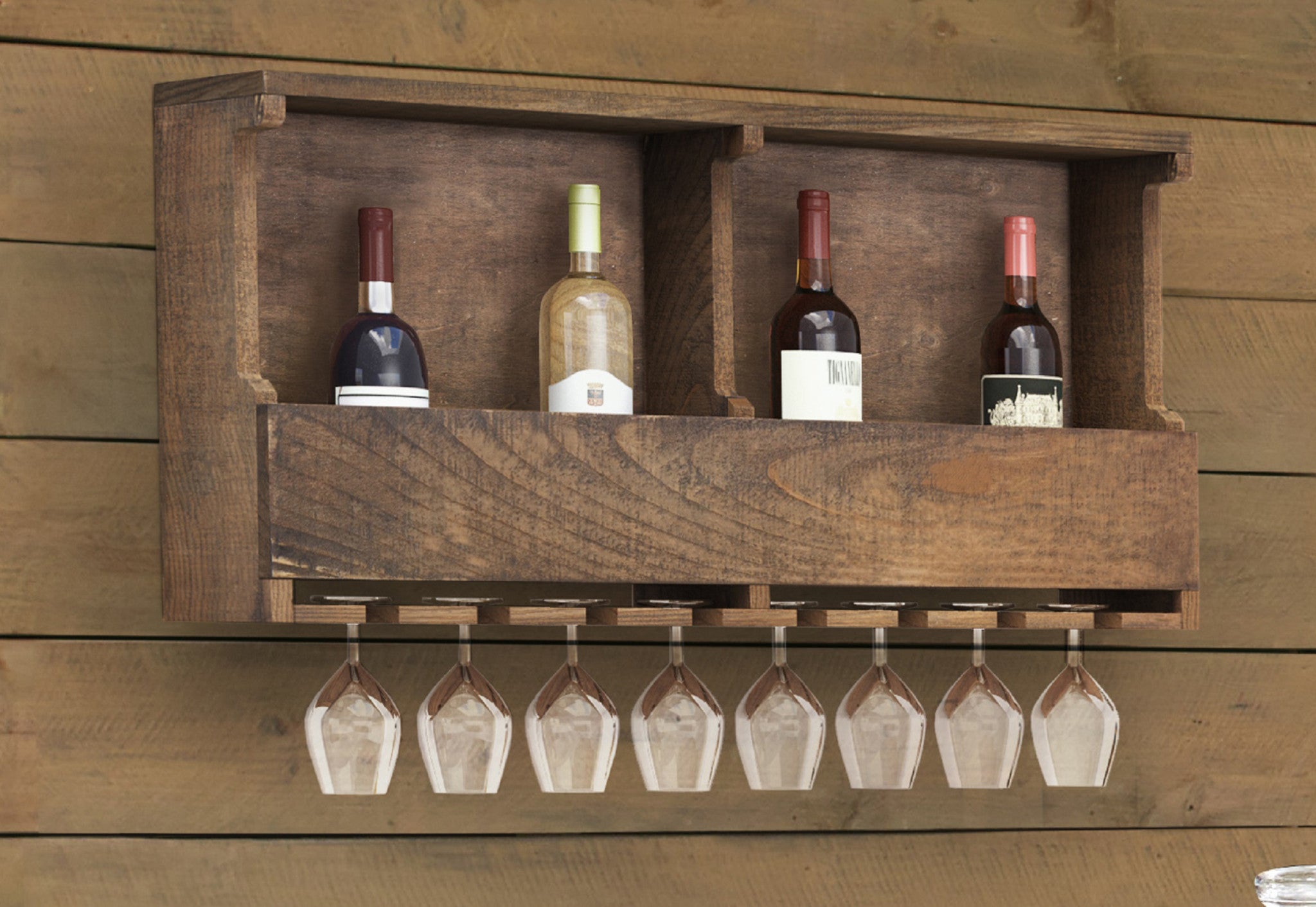 - SPACE-SAVING DESIGN: Maximizes your wall space; this wall-mounted wine rack holds up to eight standard wine bottles and eight glasses; perfect for small spaces and adding a touch of rustic elegance to your wall décor; dimensions: 36" W x 8" D x 18" H