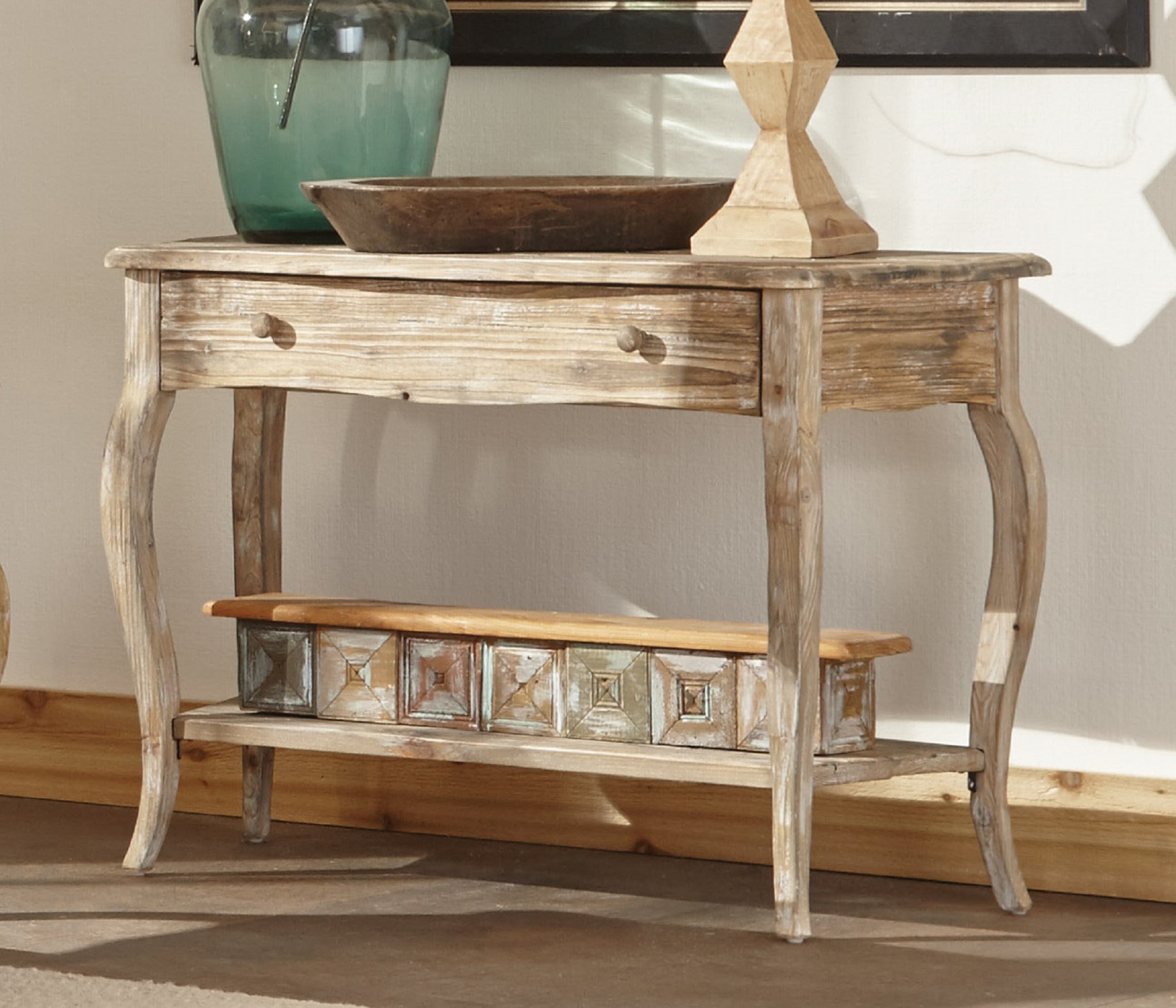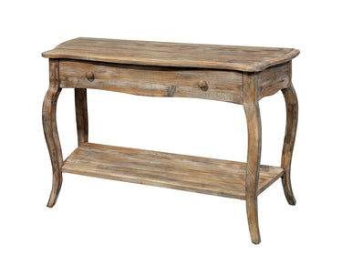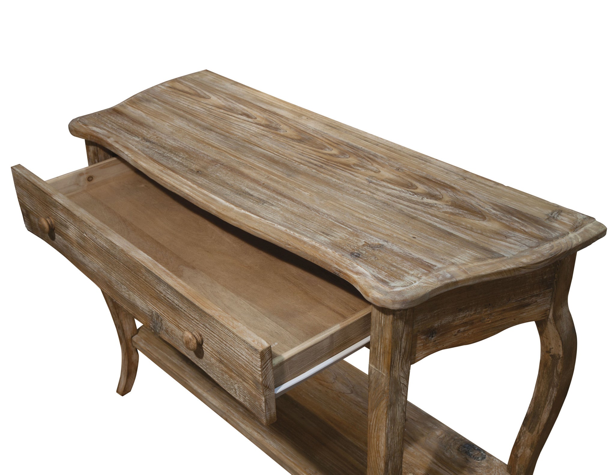 Rustic Collection of reclaimed wood furniture features handcrafted design and a reduced impact on the environment. The light, driftwood finish allows for the natural wood grain to stand out. Queen Anne legs bring a sense of traditional style to this rustic, reclaimed wood collection. Console table features a wide drawer and shelf to store or display your favorite linens, décor and more.