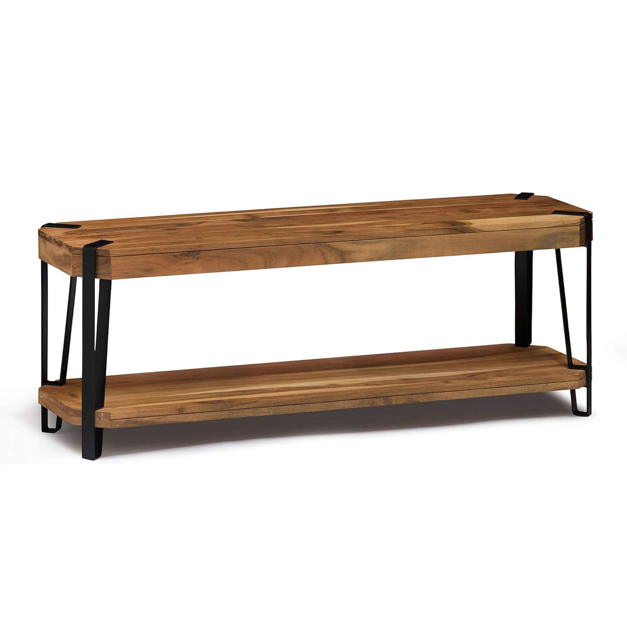 - PRODUCT DETAILS – Materials: Solid Acacia wood with Metal. Overall Dimension: (L) 48" x (W) 14" x (H) 18", Shelf: (L) 42" x (W) 14" x (H) 11.1", Floor to base: (H) 2.7". Weight Capacity: 300lbs. Includes nylon floor protectors. Color: Natural.
