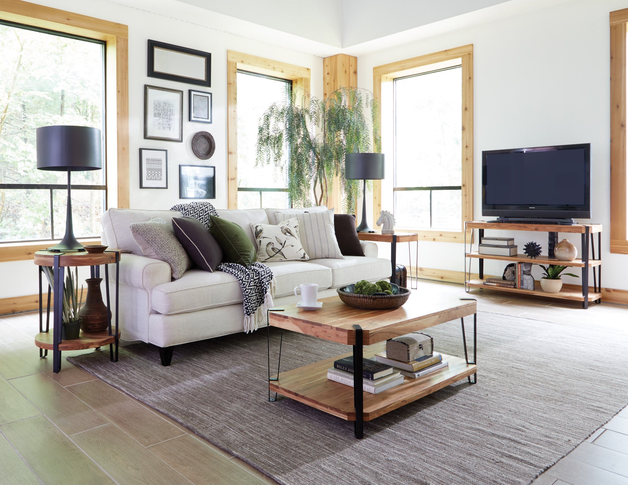 Industrial-styled Ryegate features solid wood tops with wood veneers. These tables make a strong industrial modern statement in your living space. Each tabletop is unique; no two tops will be exactly alike. Constructed of natural acacia wood. Each of our products includes nylon floor protectors. The knots and cracks add to the wood's character. A clear natural finish enhances the beautiful features in each piece of wood.