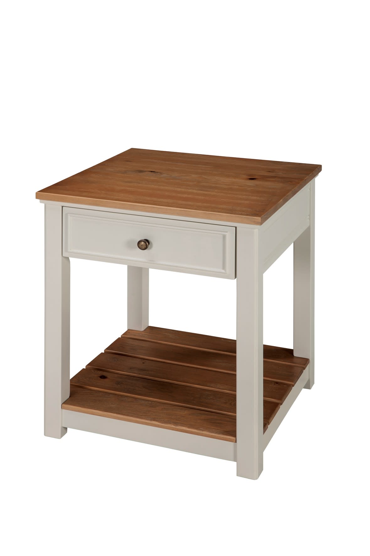 Savannah collection offers modern cottage styling; with its wood top and white painted legs it offers fresh style to your living space. Savannah includes end tables, console tables and media/storage pieces. You can design the perfect living room for your home. This large end table features both a drawer and lower shelf for additional storage or display space. The pine construction makes this piece sturdy and durable.