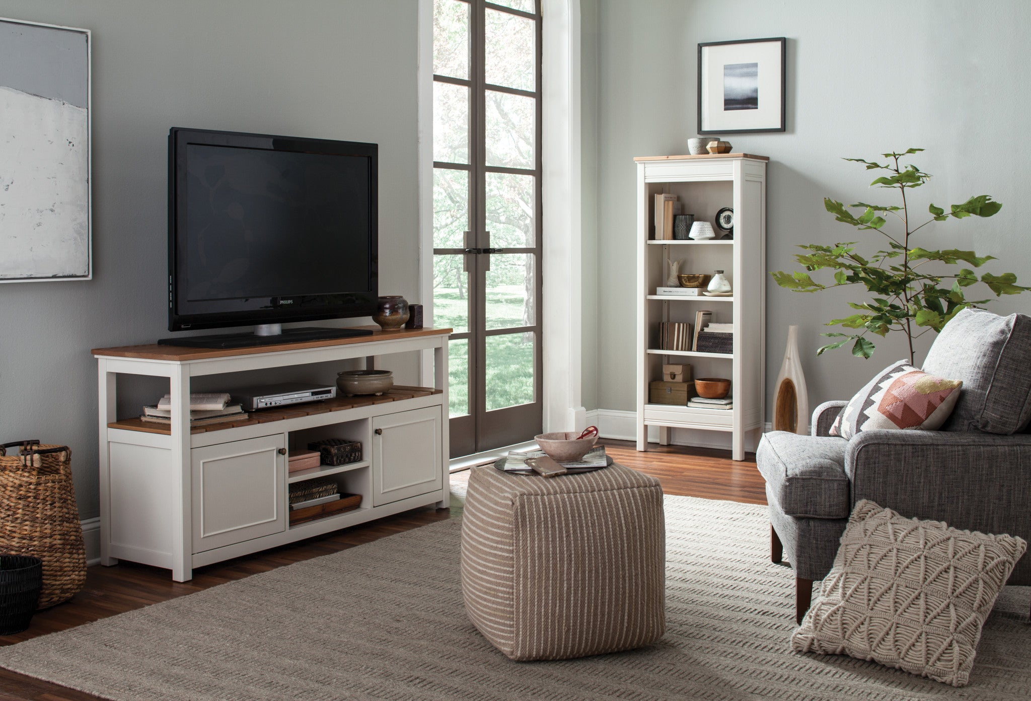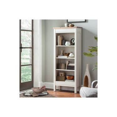 Savannah collection offers modern cottage styling; with its wood top and white painted legs it offers fresh style to your living space. Savannah includes end tables, console tables and media/storage pieces. You can design the perfect living room for your home. This tall bookshelf features three adjustable shelves for storage or display space. The pine construction makes this piece sturdy and durable.