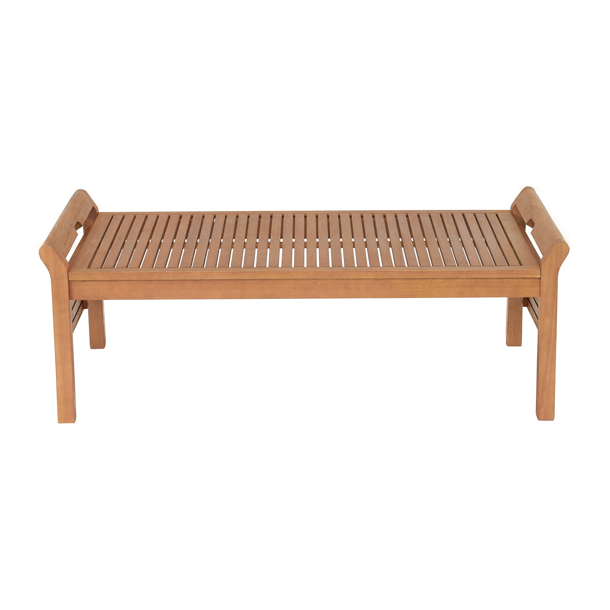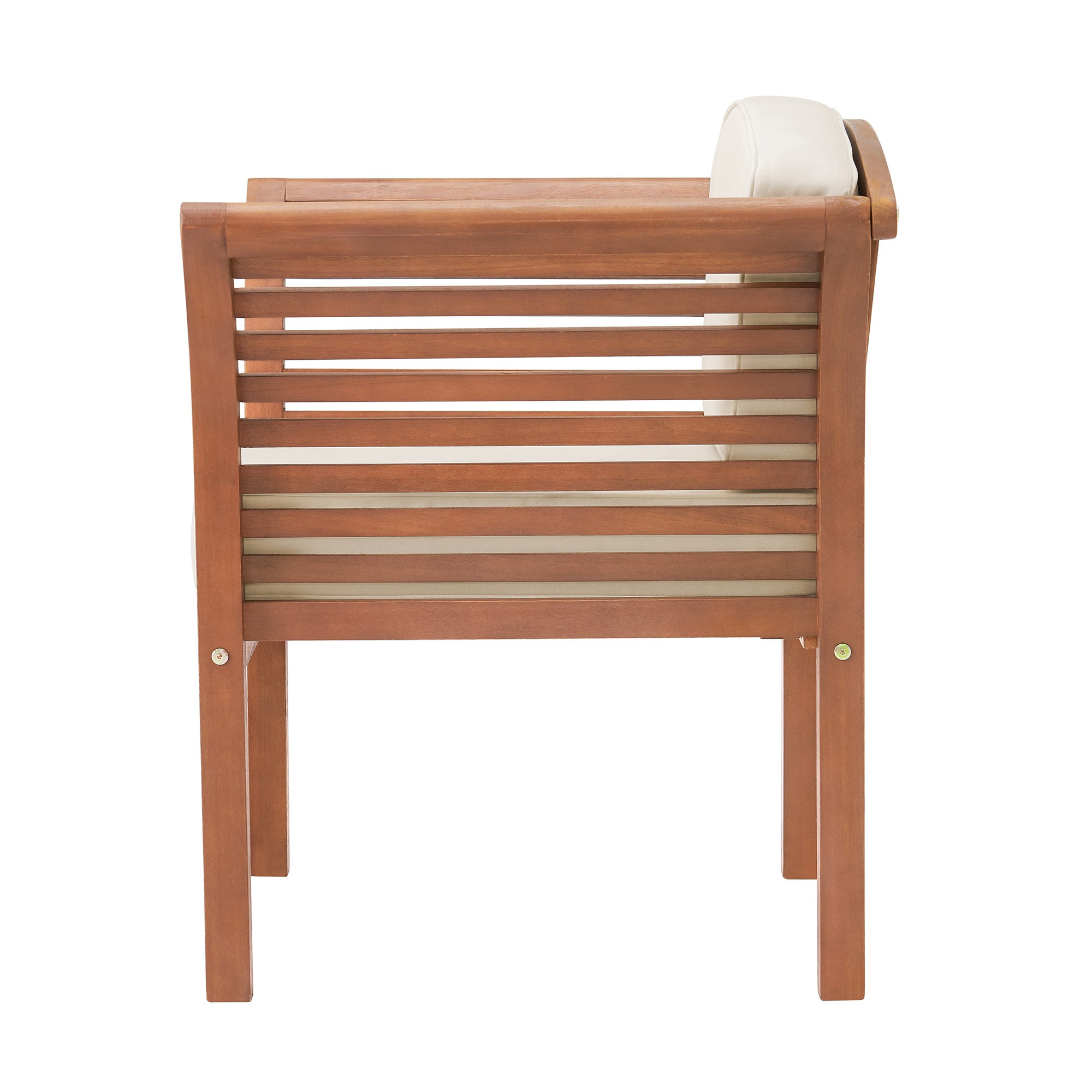Relax on your patio, garden or porch in this eucalyptus outdoor set. The two chairs have open-slat style with elegantly curved armrests. The coffee table and chairs have a natural finish, which is sure to provide chic style to your outdoor area. Table and chair frames are made from durable eucalyptus wood that will stand up to varying weather conditions. The chairs include plush weather-resistant back and seat cushions. This is set is not only beautiful, but it’s incredibly comfortable, so you can sit outside all day long with a cold, refreshing drink and a good book.