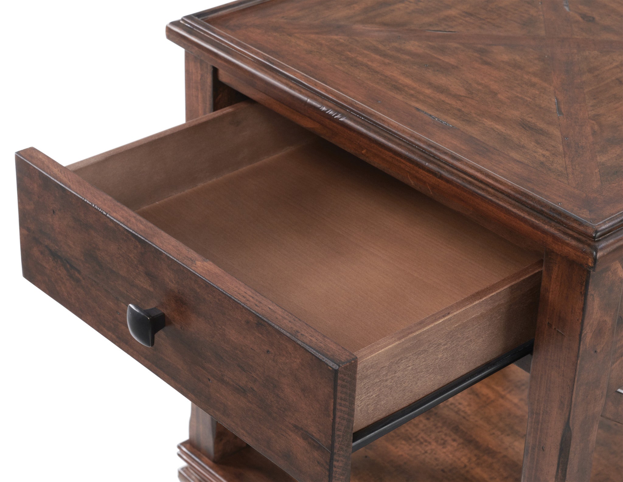 This classic collection is rich in character. The open side panels give a relaxed feel to these timeless pieces. Made of pine wood and finished in a distressed cherry stain that brings warmth to your living space. This set of four tables is sure to make a statement in your living room.