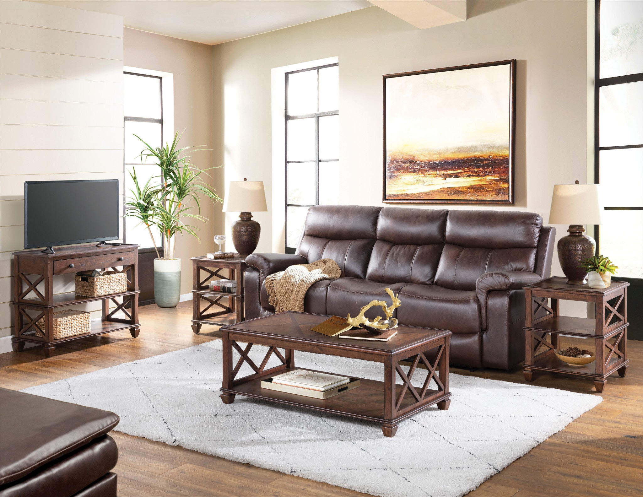 - [COMPLETE LIVING ROOM SOLUTION] Elevate your space with the Stockbridge 4-Piece Set; includes a coffee table, two end tables with dual shelves, and a TV console table, all in solid pine with a warm cherry finish