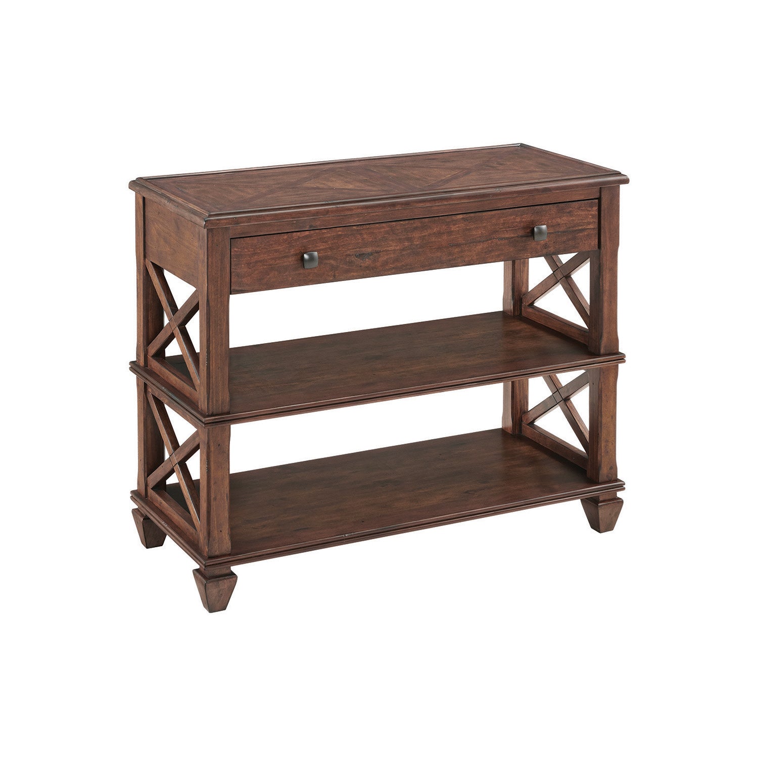 This classic collection is rich in character. The open side panels give a relaxed feel to these timeless pieces. Made of pine wood and finished in a distressed cherry stain that brings warmth to your living space. The console with drawer is a gorgeous accent as an entryway table, behind your sofa or possibly even for a flat-screen television.