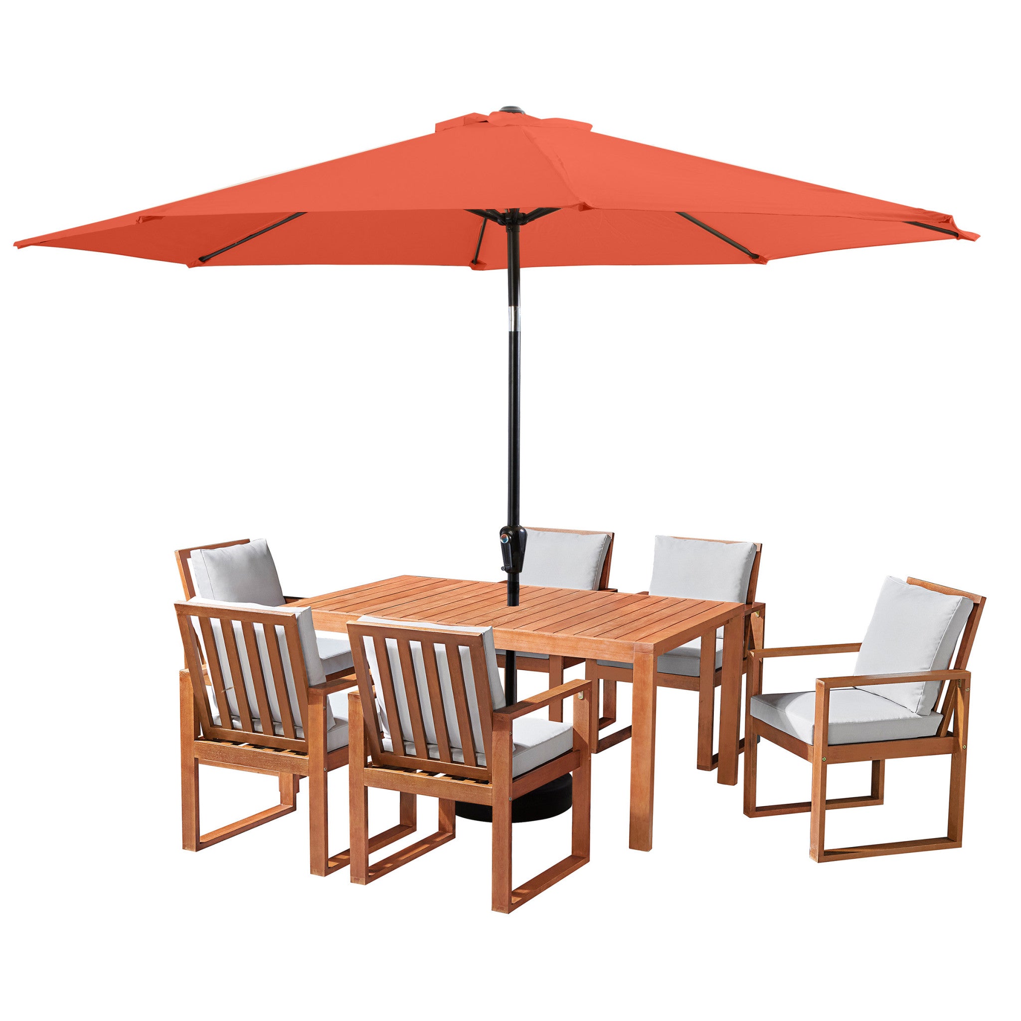 Gather with friends and family to enjoy conversations or meals outside with this stylish wood outdoor 8-piece dining set. Frame is made from durable eucalyptus wood that will stand up to varying weather conditions, and the generously padded all-weather chair cushions will provide luxurious comfort all day long. The neutral wood finish and gray colored cushions will easily match with any accent pieces in your outdoor space. The 10-foot patio umbrella with auto tilt will protect your family and friends from the sun providing the perfect outdoor entertainment space!