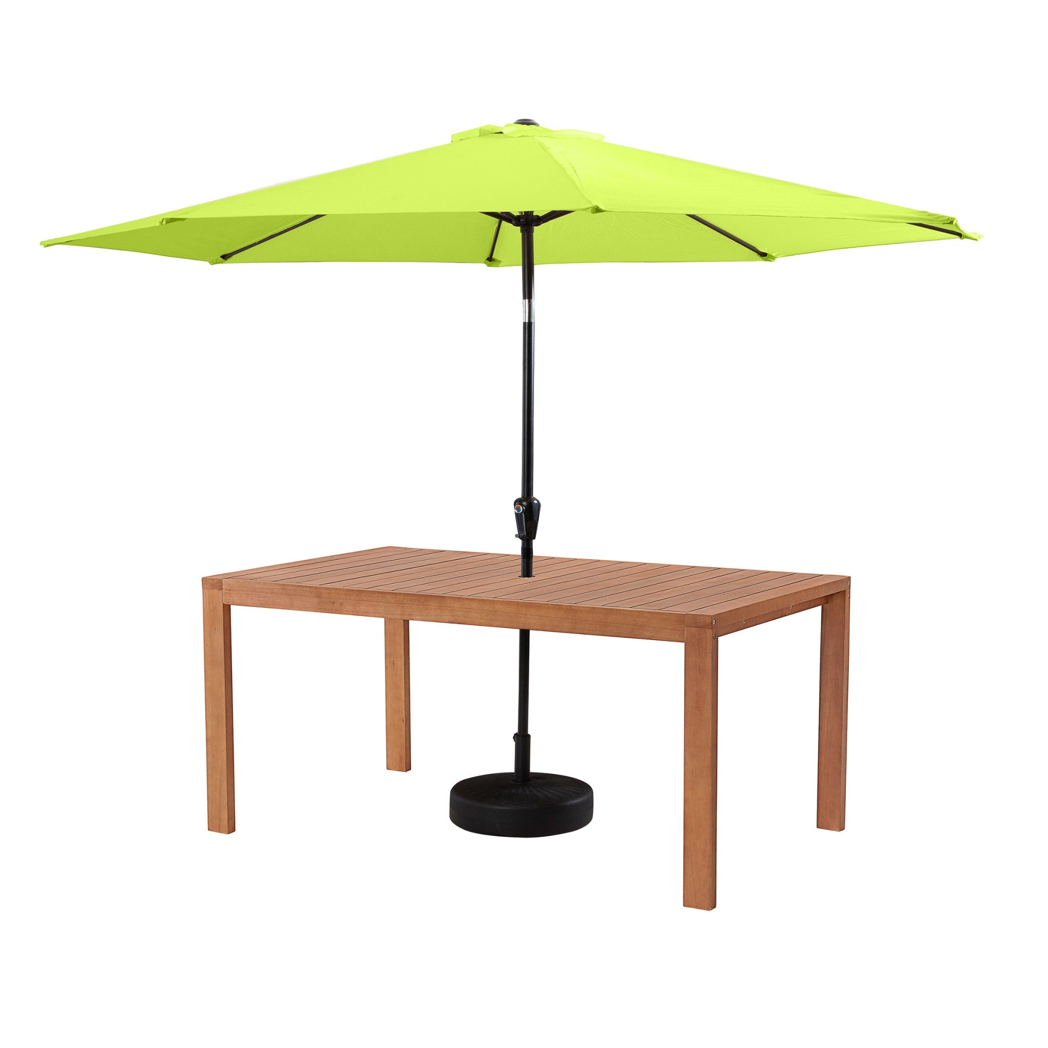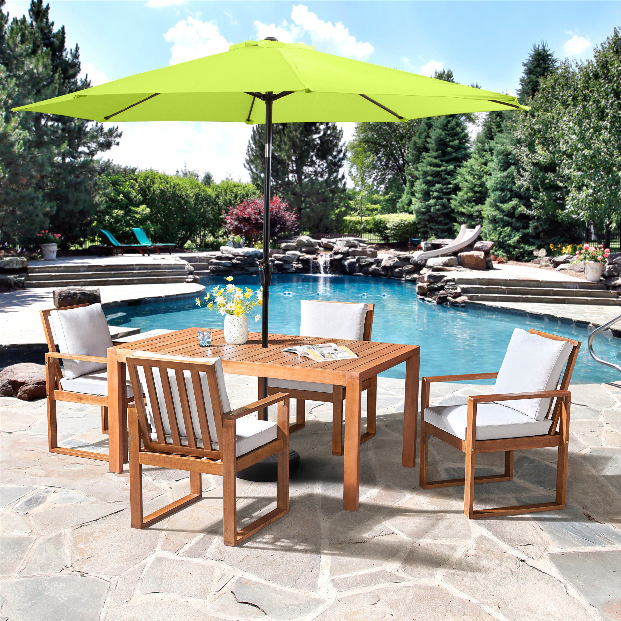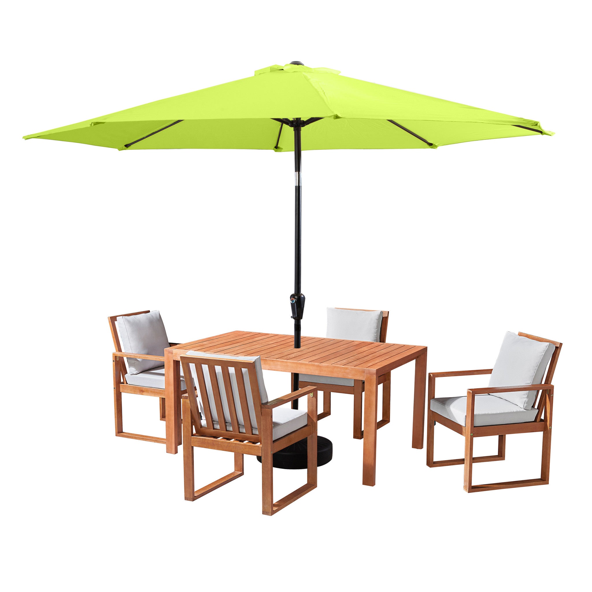 • [ENHANCED OUTDOOR LIVING] The Weston Eucalyptus Wood Dining Set includes four chairs and a spacious table, ideal for family meals. A 10-foot lime green umbrella provides shade, ensuring a cool environment outdoors