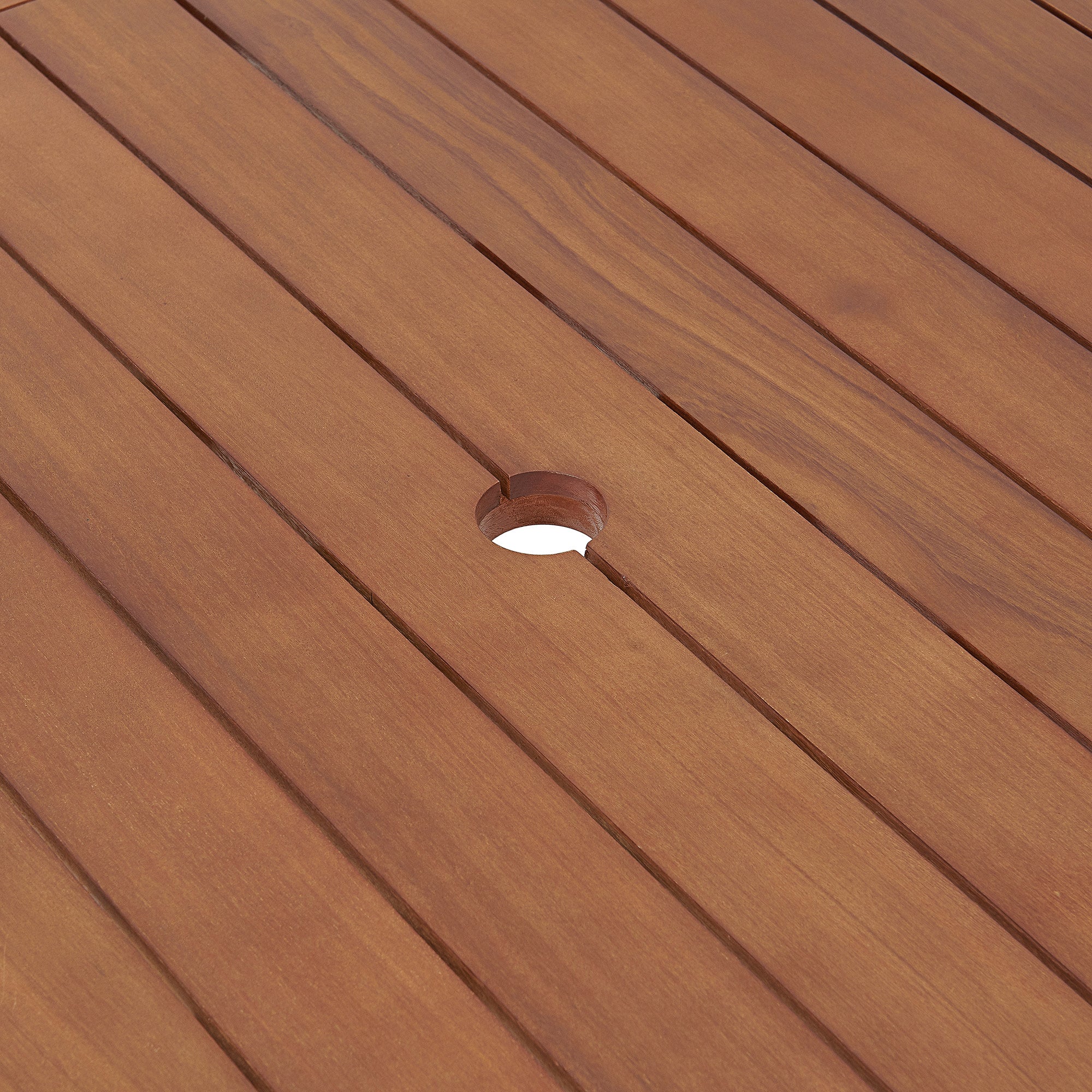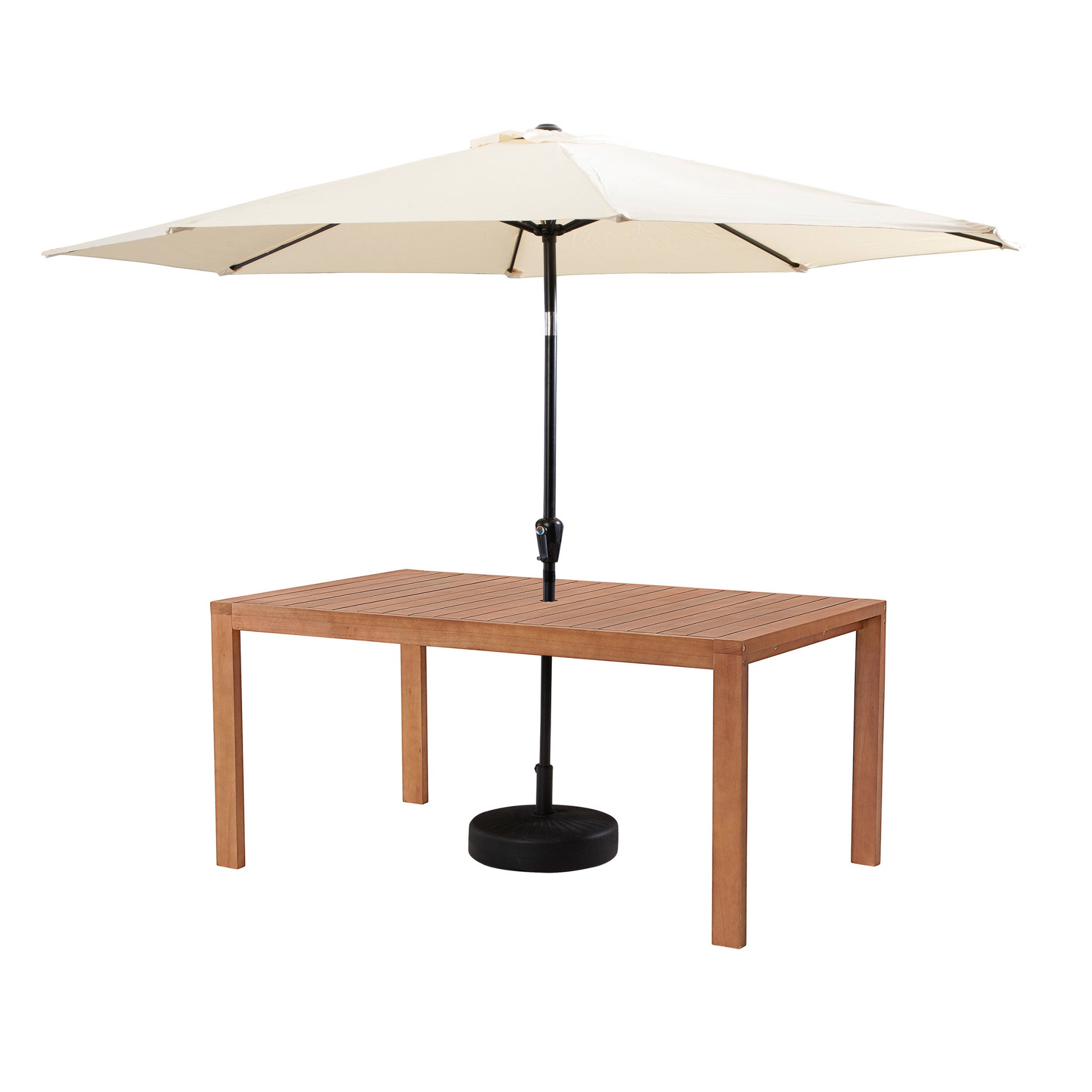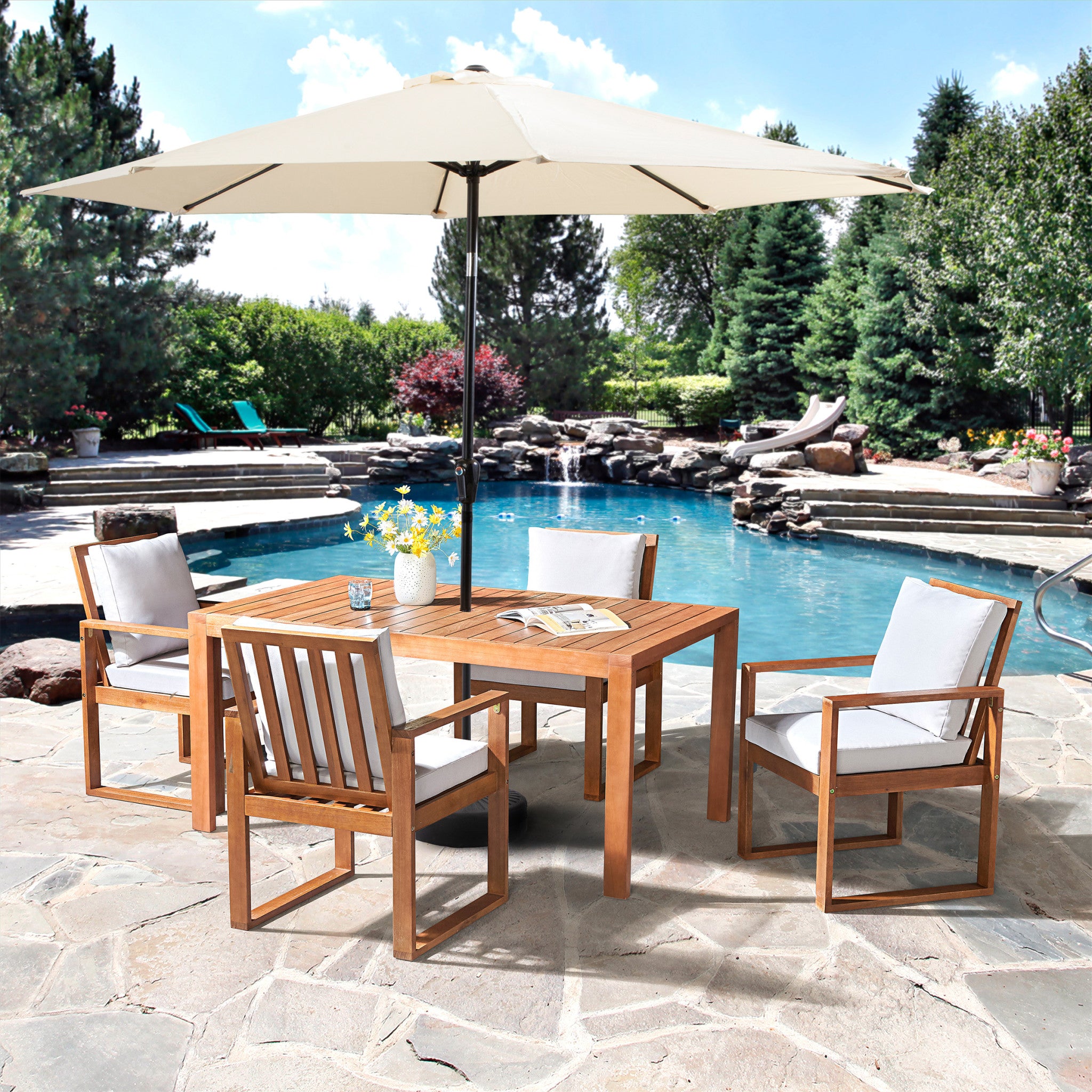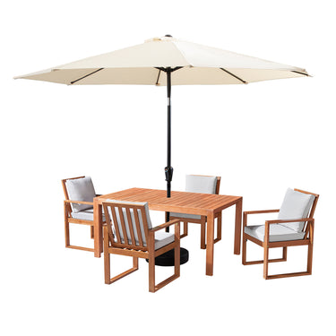 - [DIMENSIONS & MATERIALS] Dining table 63" W x 37.5" D x 29.5" H, chairs 23.5" W x 26" D x 36" H with a 10-foot umbrella. Made from durable eucalyptus wood for weather resistance