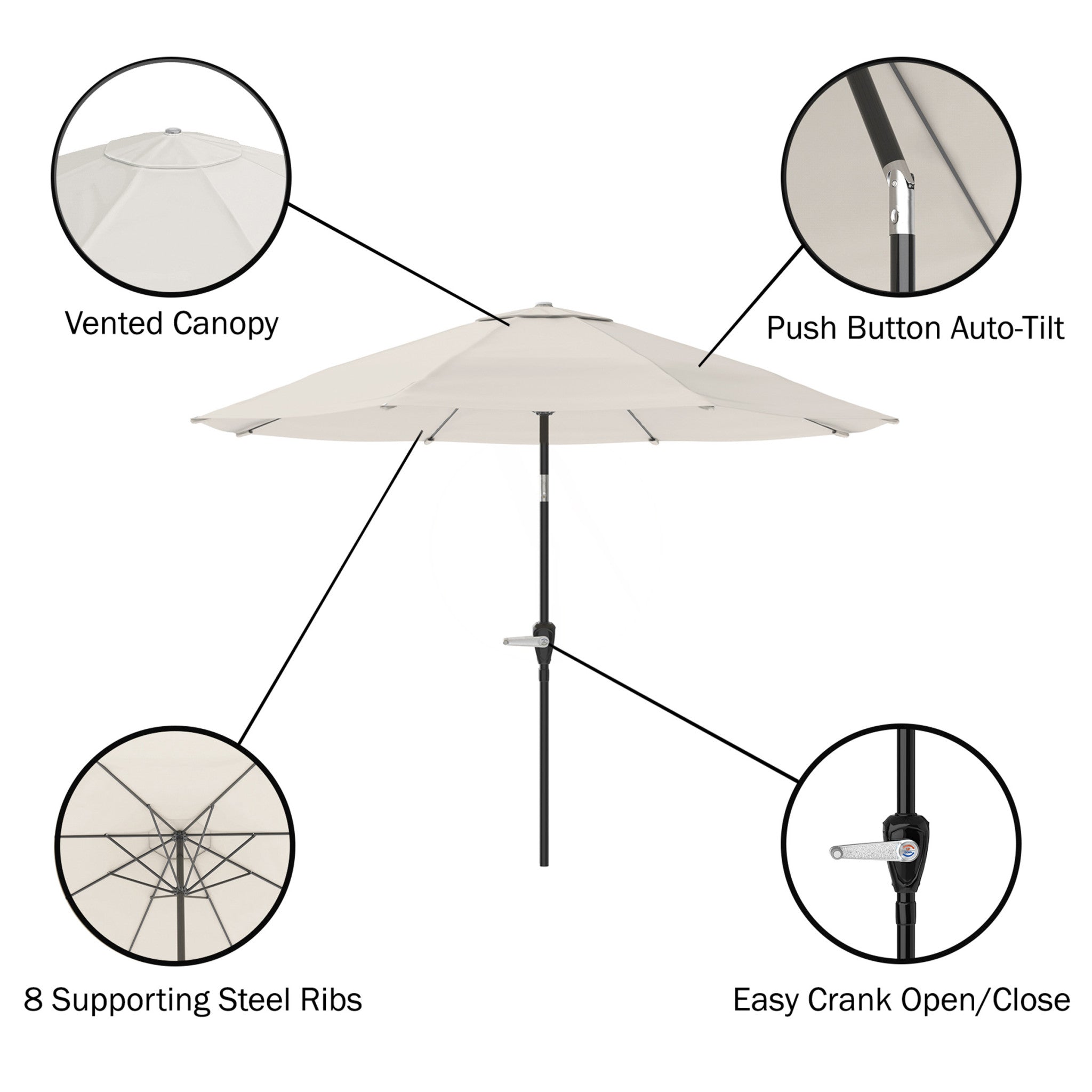 - [EFFORTLESS FUNCTIONALITY] Features an easy-to-use crank handle and auto-tilt for quick adjustment of the 10-foot umbrella; provides optimal shade throughout the day, making it perfect for outdoor dining or lounging in any weather conditions