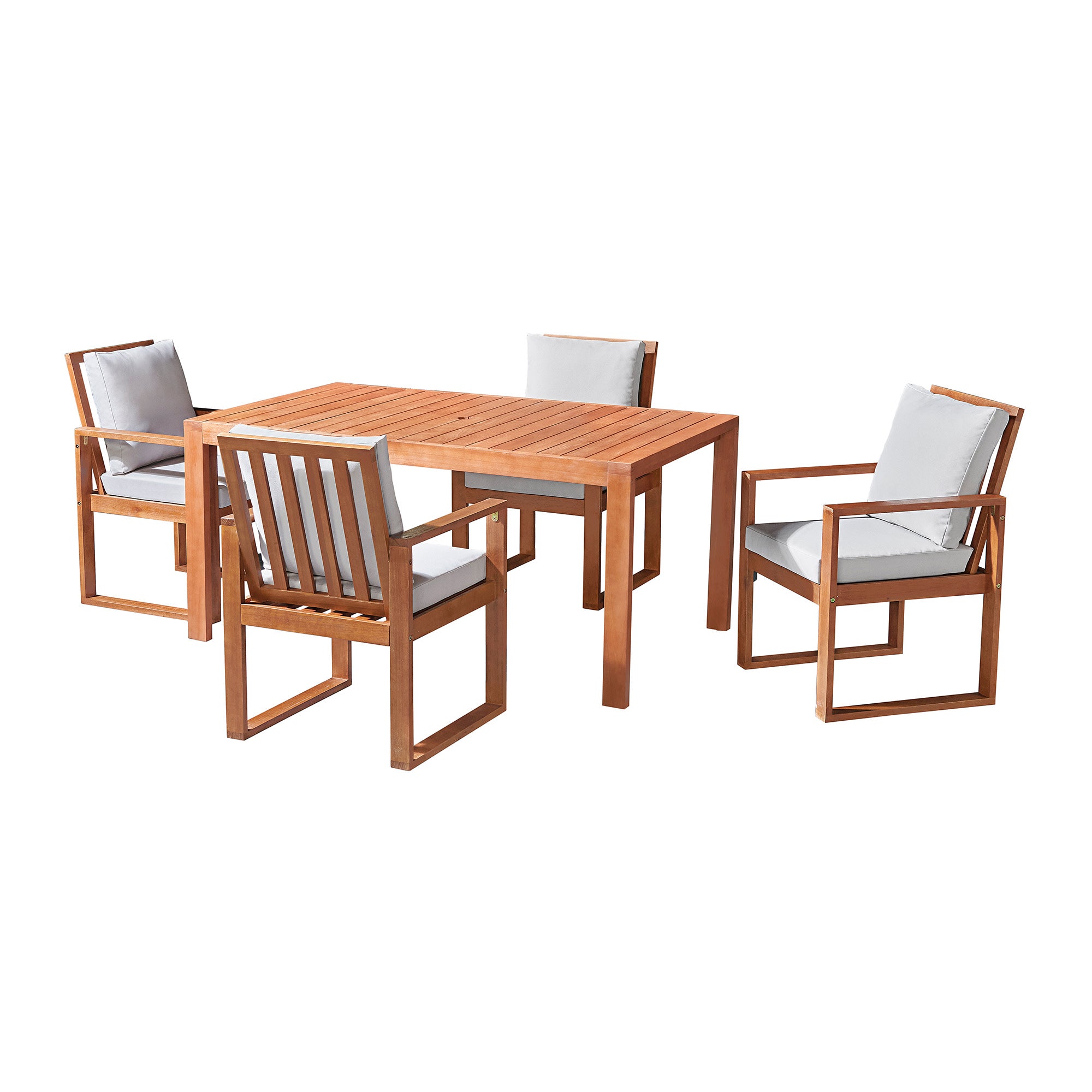 Gather with friends and family to enjoy conversations or meals outside with this stylish wood 6-piece dining set. Its clean lines and simplicity add refinement to any patio setting. Frame is made from durable eucalyptus wood that will stand up to varying weather conditions, and the generously padded all-weather chair cushions will provide luxurious comfort all day long. Protect your family and friends from the sun with this attractive 10-foot patio umbrella with auto tilt. The neutral wood finish and gray colored cushions will easily match with any accent pieces in your outdoor space, or pair this with other items in the collection for the perfect outdoor entertainment space!