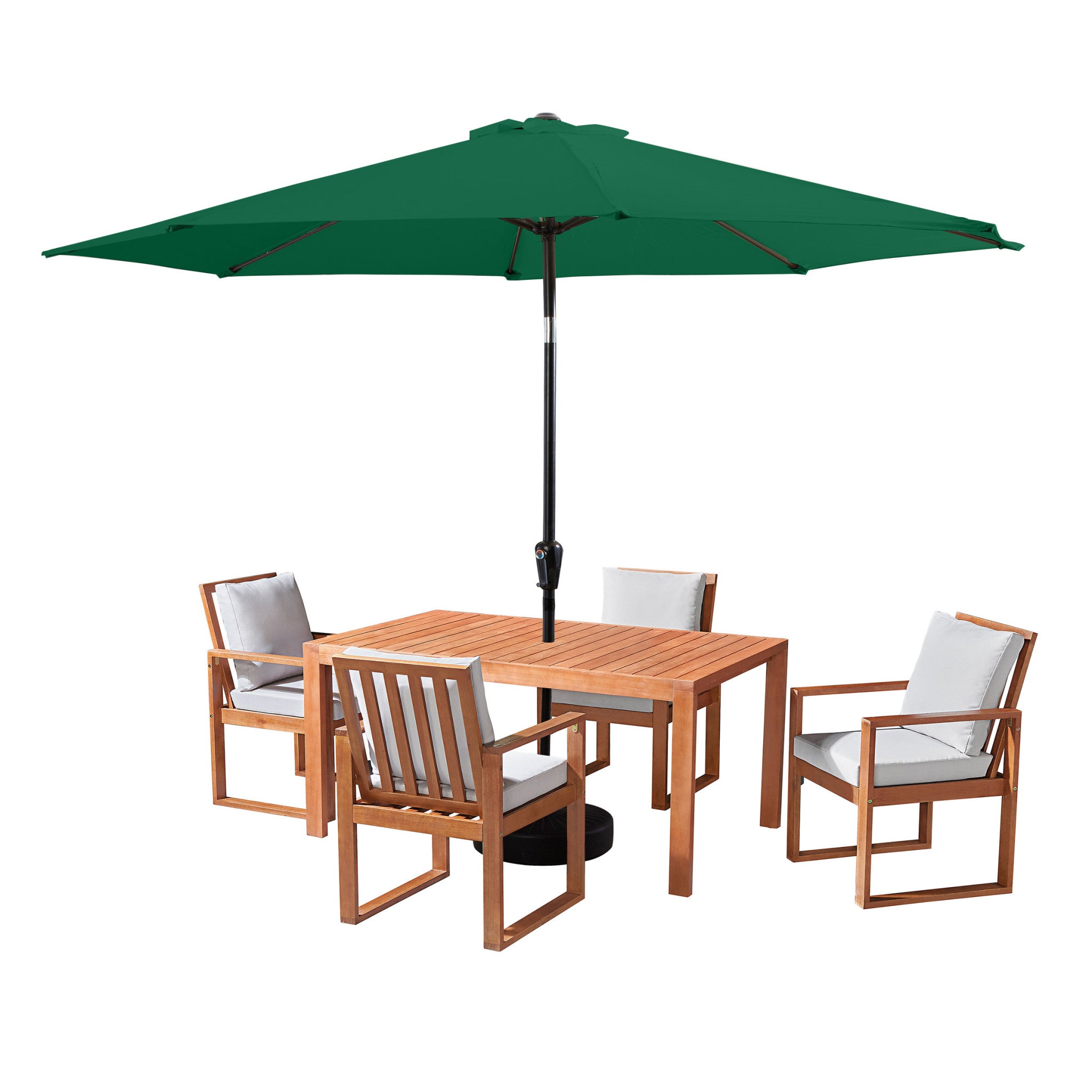 • [DIMENSIONS & MATERIAL] Includes one table measuring 63" W x 37 1/2" D x 29 1/2" H; four chairs each 23 1/2" W x 26" D x 36" H with a seat height of 19"; and a 10-foot umbrella; crafted from durable, weather-resistant eucalyptus wood