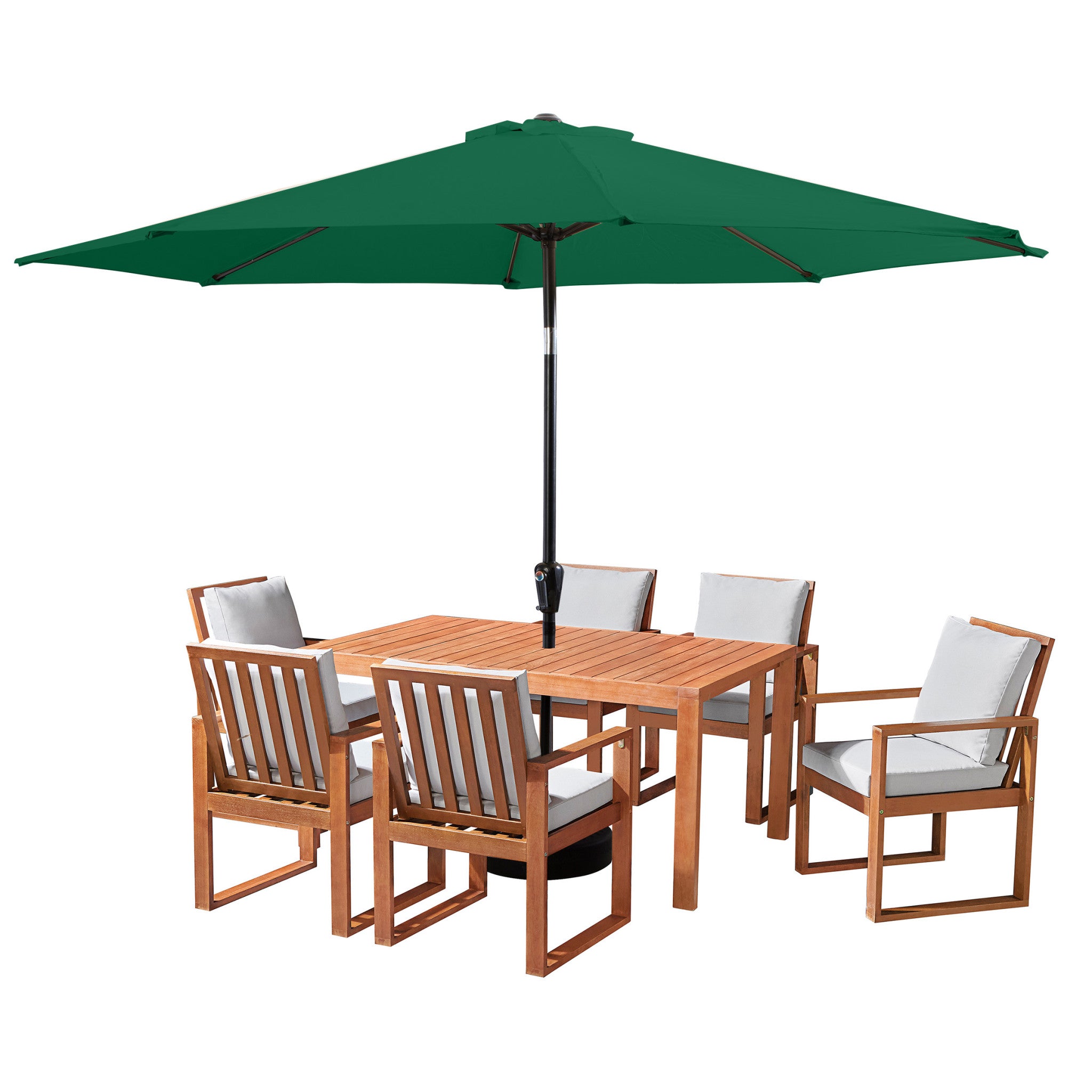 Gather with friends and family to enjoy conversations or meals outside with this stylish wood outdoor 8-piece dining set. Frame is made from durable eucalyptus wood that will stand up to varying weather conditions, and the generously padded all-weather chair cushions will provide luxurious comfort all day long. The neutral wood finish and gray colored cushions will easily match with any accent pieces in your outdoor space. The 10-foot patio umbrella with auto tilt will protect your family and friends from the sun providing the perfect outdoor entertainment space!