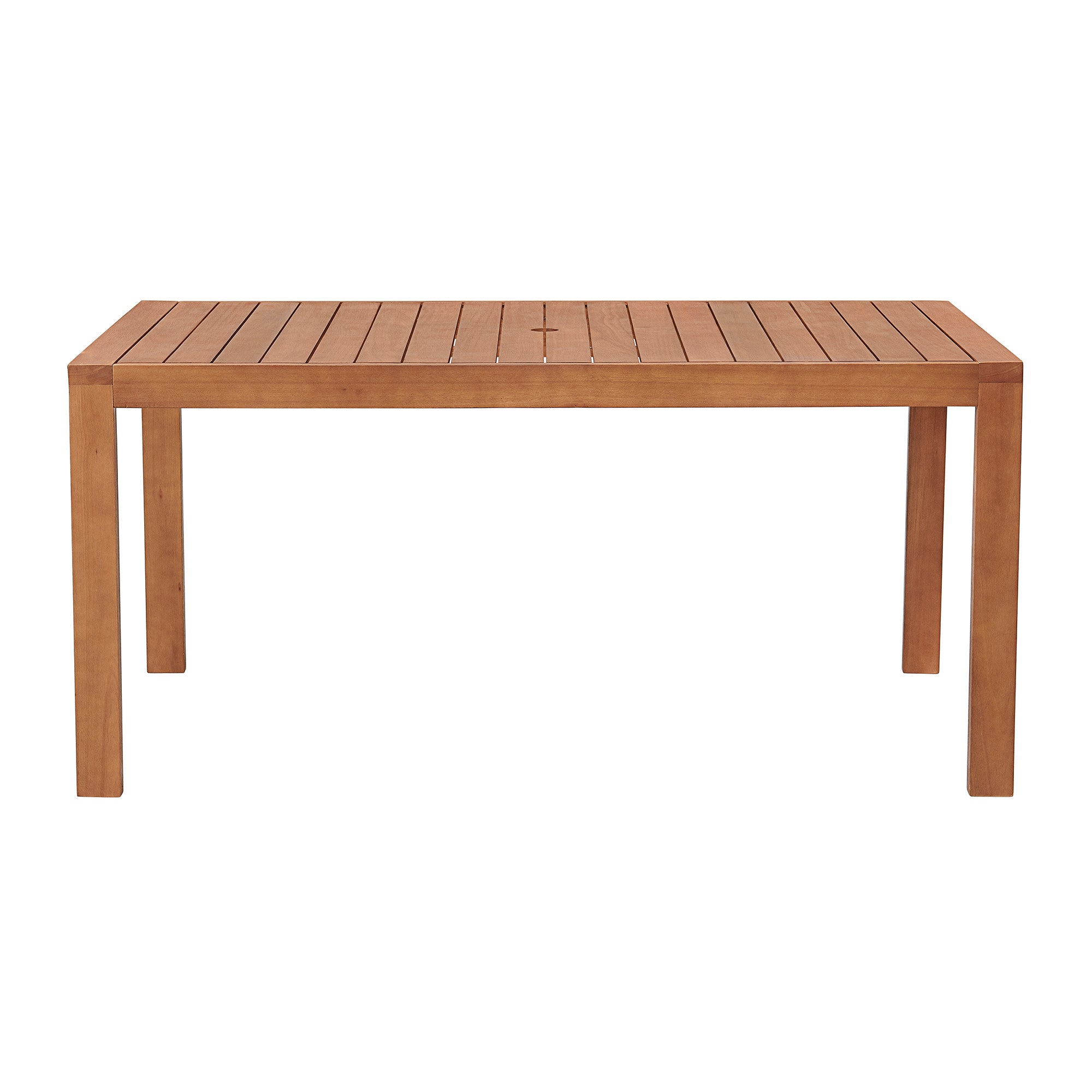 Gather with friends and family to enjoy conversations or meals outside with this stylish wood 6-piece dining set. Its clean lines and simplicity add refinement to any patio setting. Frame is made from durable eucalyptus wood that will stand up to varying weather conditions, and the generously padded all-weather chair cushions will provide luxurious comfort all day long. Protect your family and friends from the sun with this attractive 10-foot patio umbrella with auto tilt. The neutral wood finish and gray colored cushions will easily match with any accent pieces in your outdoor space, or pair this with other items in the collection for the perfect outdoor entertainment space!