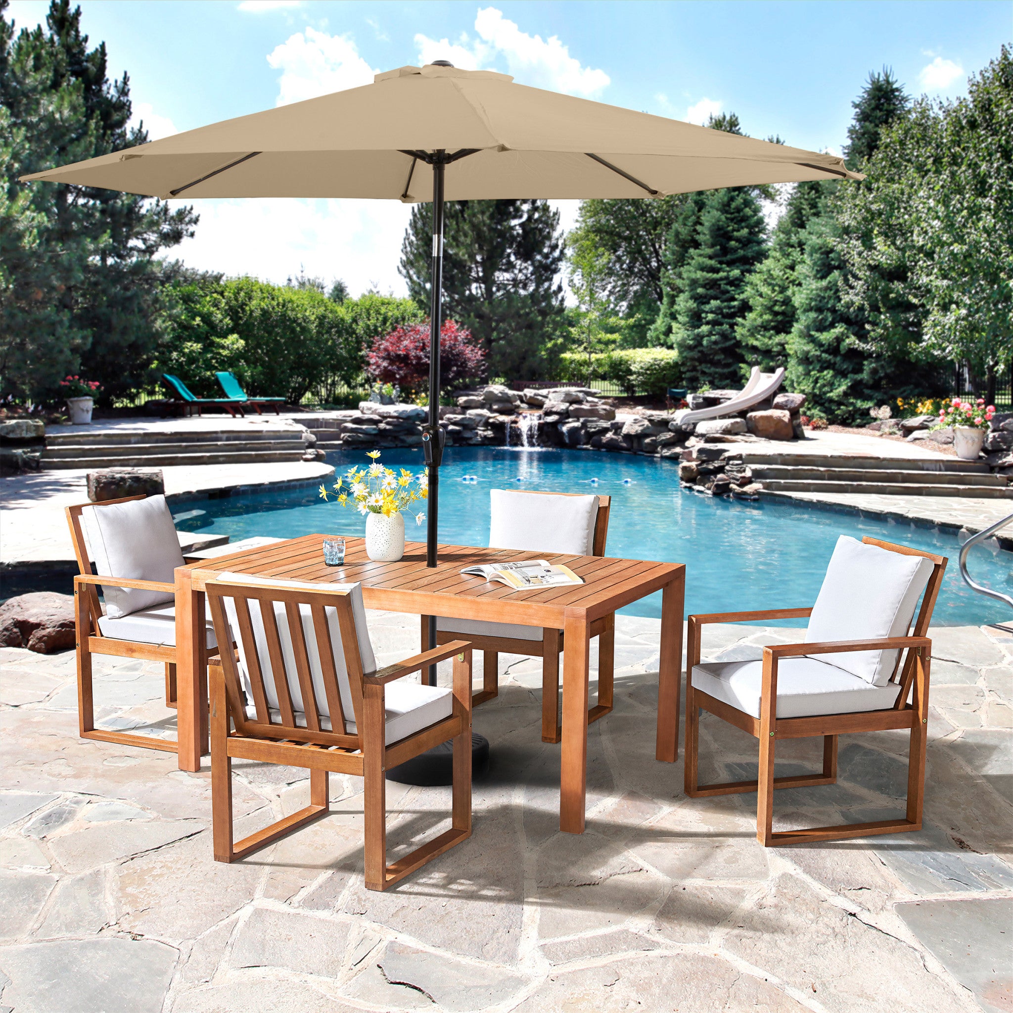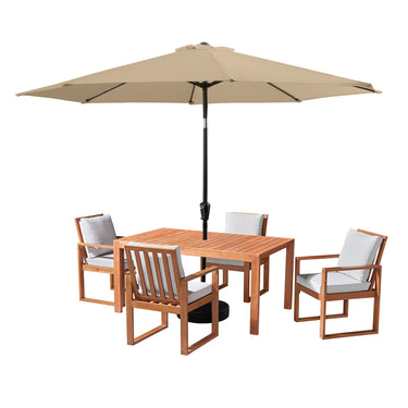 • [DIMENSIONS & MATERIAL] Dining table 63" W x 37.5" D x 29.5" H, chairs 23.5" W x 26" D x 36" H with 19" seat height. Umbrella spans 120" L x 120" W x 98" H. Crafted from weather-resistant eucalyptus wood