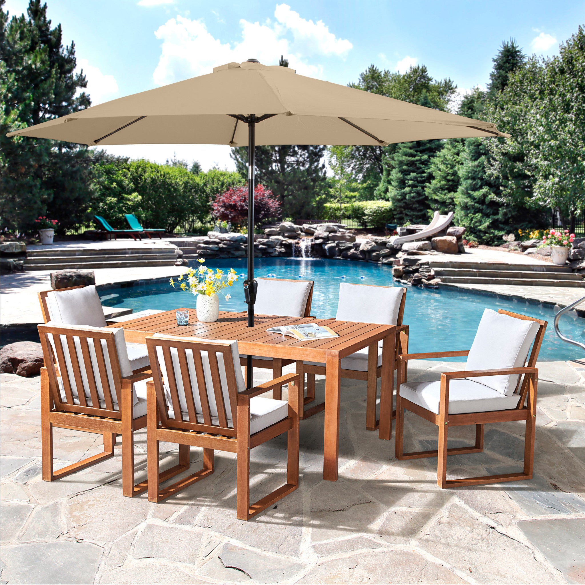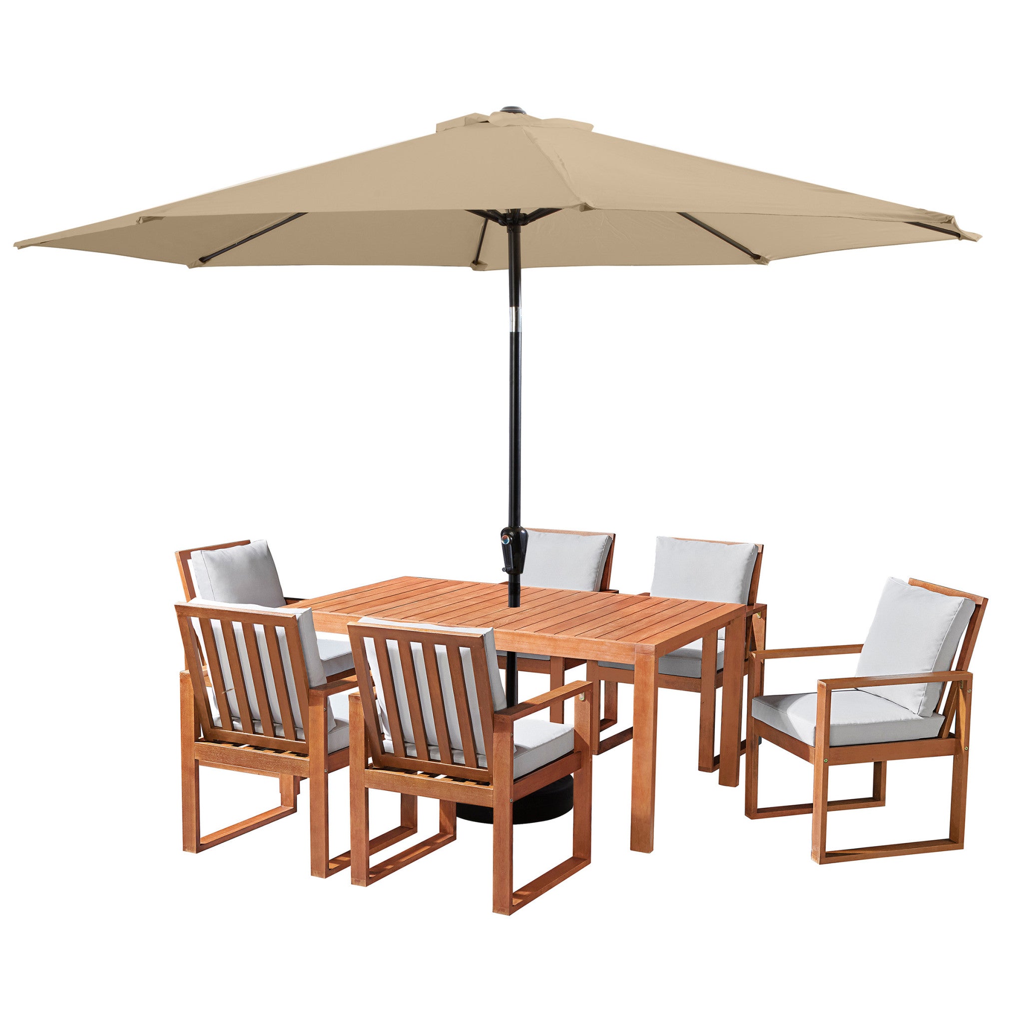 Gather with friends and family to enjoy conversations or meals outside with this stylish wood outdoor 8-piece dining set. Frame is made from durable eucalyptus wood that will stand up to varying weather conditions, and the generously padded all-weather chair cushions will provide luxurious comfort all day long. The neutral wood finish and gray colored cushions will easily match with any accent pieces in your outdoor space. The 10-foot patio umbrella with auto tilt will protect your family and friends from the sun providing the perfect outdoor entertainment space!