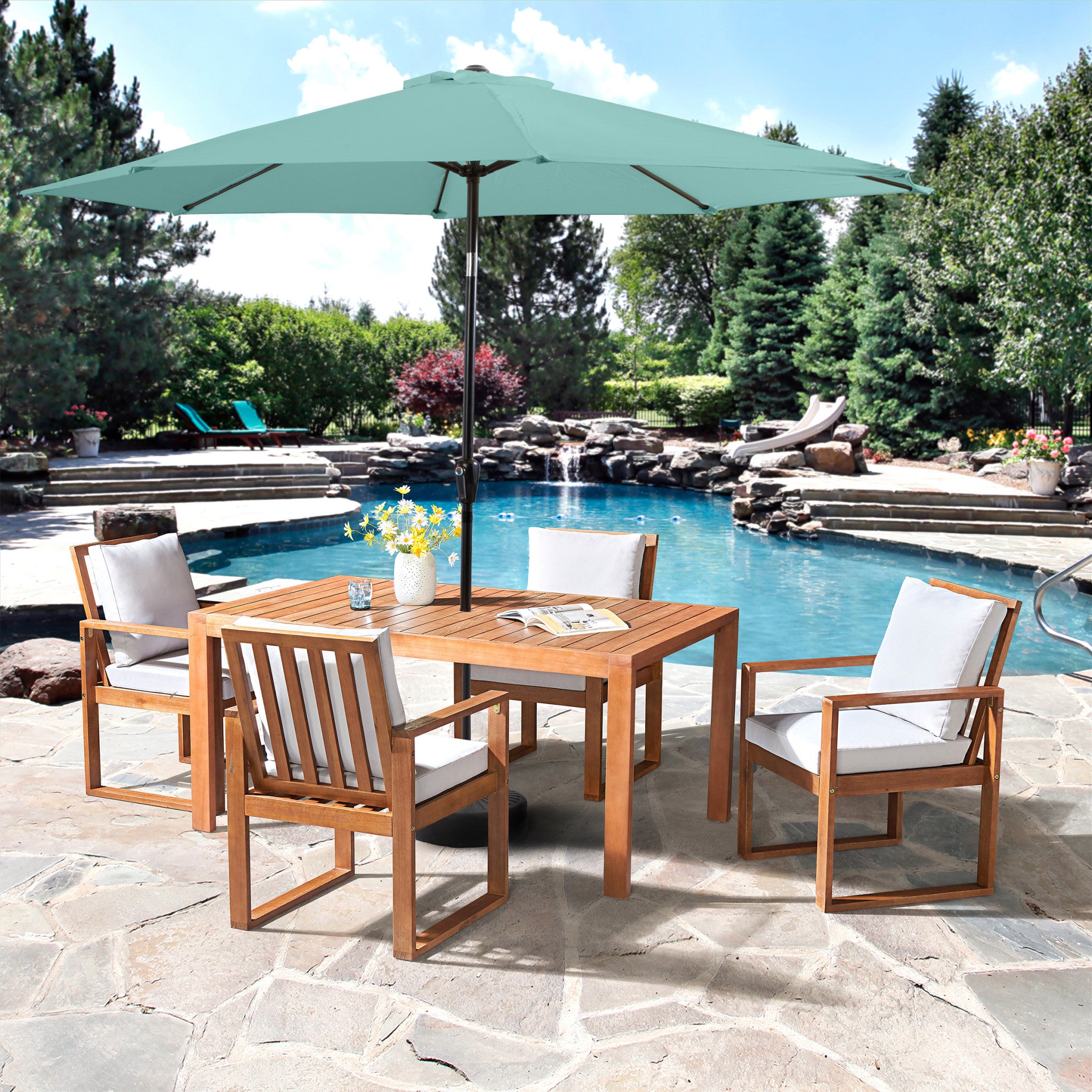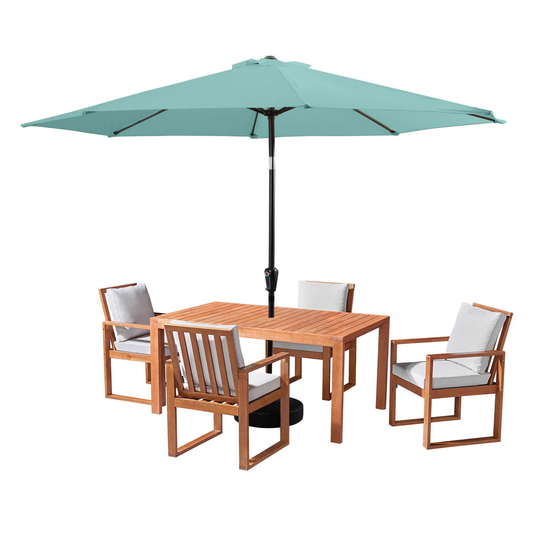 - [DIMENSIONS AND MATERIALS] Dining table 63" W x 37.5" D x 29.5" H. Chairs 23.5" W x 26" D x 36" H, with 19" seat height. Umbrella 120" L x 120" W x 98" H. Made from weather-resistant eucalyptus wood for durability