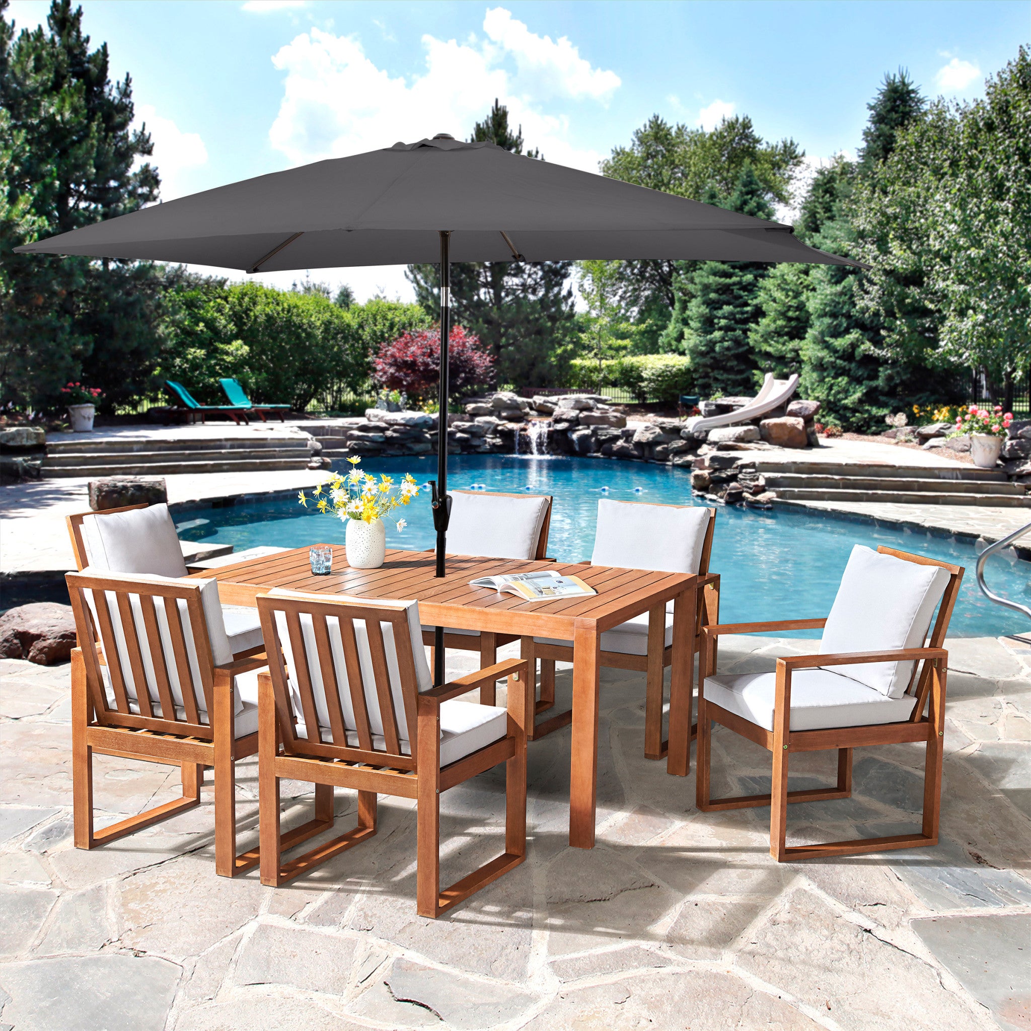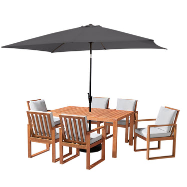 Gather with friends and family to enjoy conversations or meals outside with this stylish wood 8-piece dining set. Its clean lines and simplicity add refinement to any patio setting. Frame is made from durable eucalyptus wood that will stand up to varying weather conditions, and the generously padded all-weather chair cushions will provide luxurious comfort all day long. The neutral wood finish and gray colored cushions will easily match with any accent pieces in your outdoor space. The set also includes a 10-foot rectangular umbrella. The sun umbrella outdoor patio shade is an attractive piece of outdoor décor that provides quality sun protection whether you’re entertaining guests on the deck or lounging by your swimming pool.