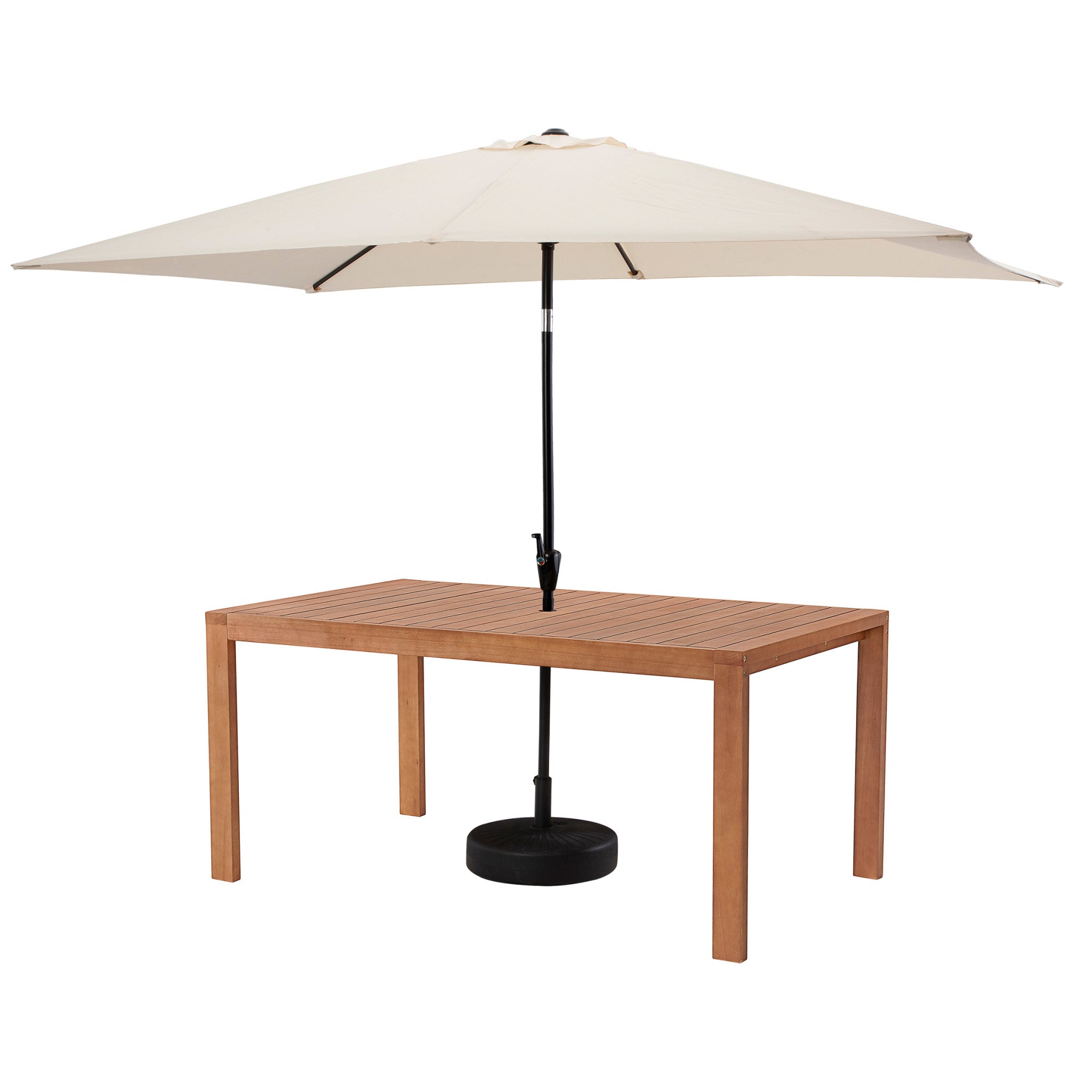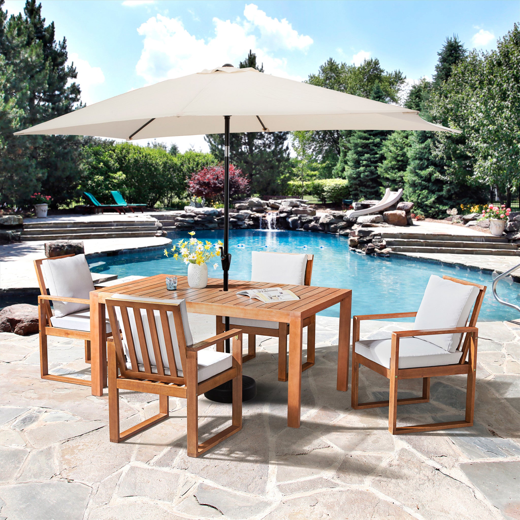 - [WEATHER-RESISTANT QUALITY] Constructed from durable eucalyptus wood, this set withstands weather and UV damage. The beige, 10-foot umbrella provides ample shade, crafted to maintain its color and integrity over time