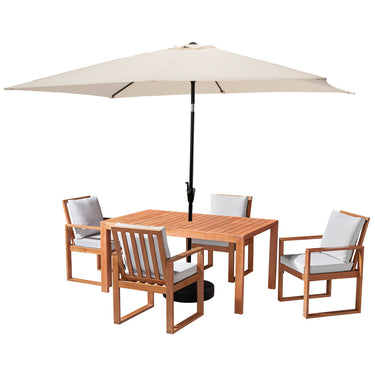Gather with friends and family to enjoy conversations or meals outside with this stylish wood 6-piece dining set. Its clean lines and simplicity add refinement to any patio setting. Frame is made from durable eucalyptus wood that will stand up to varying weather conditions, and the generously padded all-weather chair cushions will provide luxurious comfort all day long. The neutral wood finish and gray colored cushions will easily match with any accent pieces in your outdoor space. The set also includes a 10-foot rectangular umbrella. The sun umbrella outdoor patio shade is an attractive piece of outdoor décor that provides quality sun protection whether you’re entertaining guests on the deck or lounging by your swimming pool.