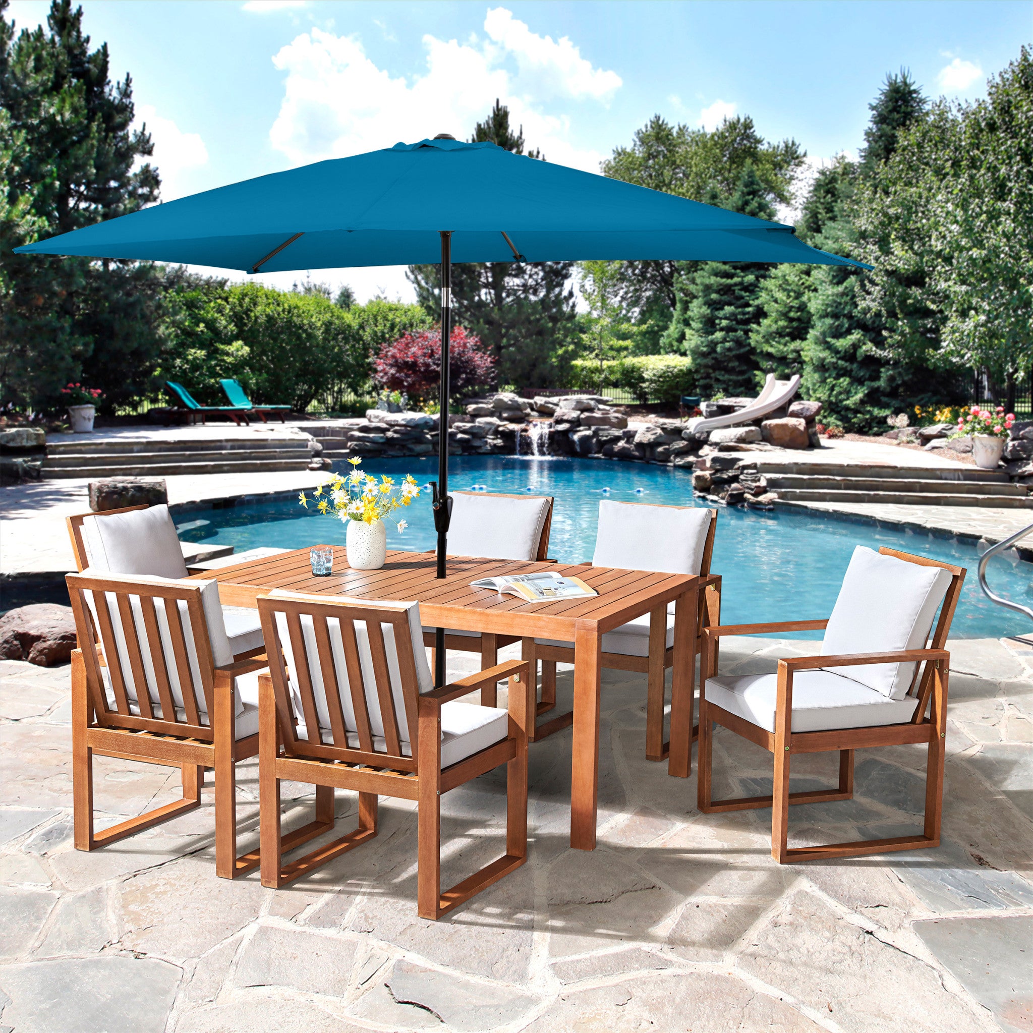 - [COMPLETE OUTDOOR DINING SET] The set includes a spacious 63" W x 37 1/2" D table and six comfortable chairs, paired with a 10-foot turquoise umbrella for shade. Crafted from eucalyptus wood and weather-resistant gray cushions for easy maintenance