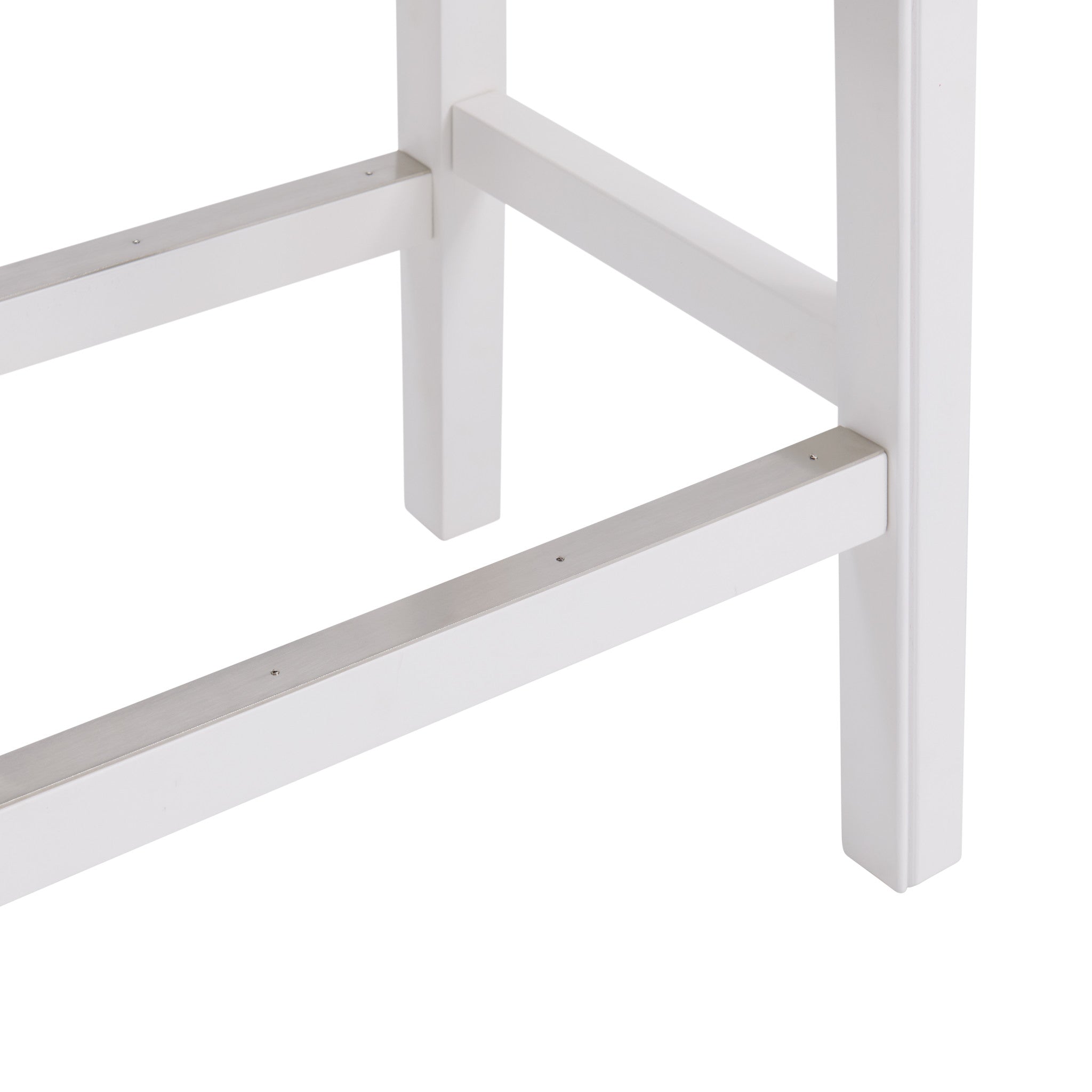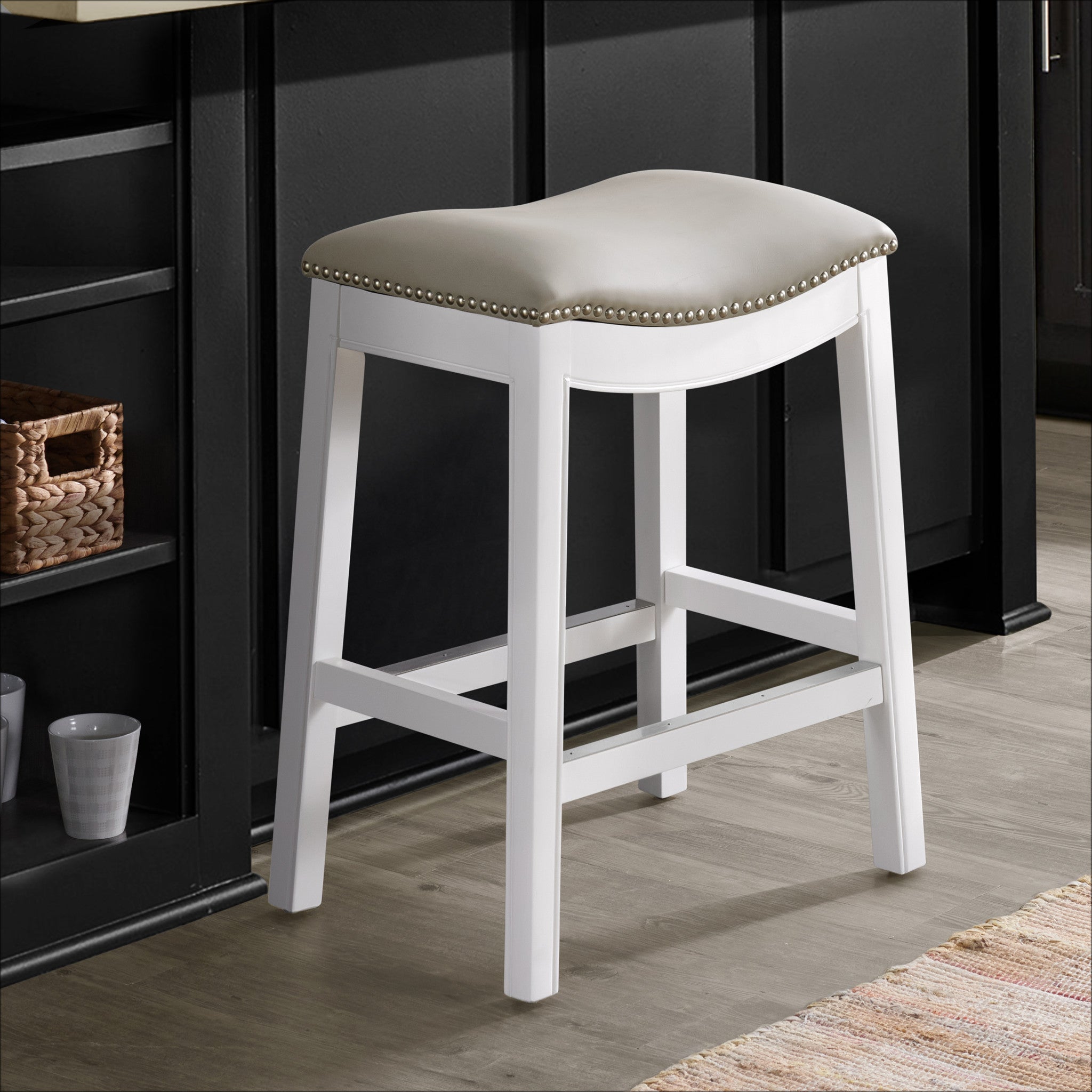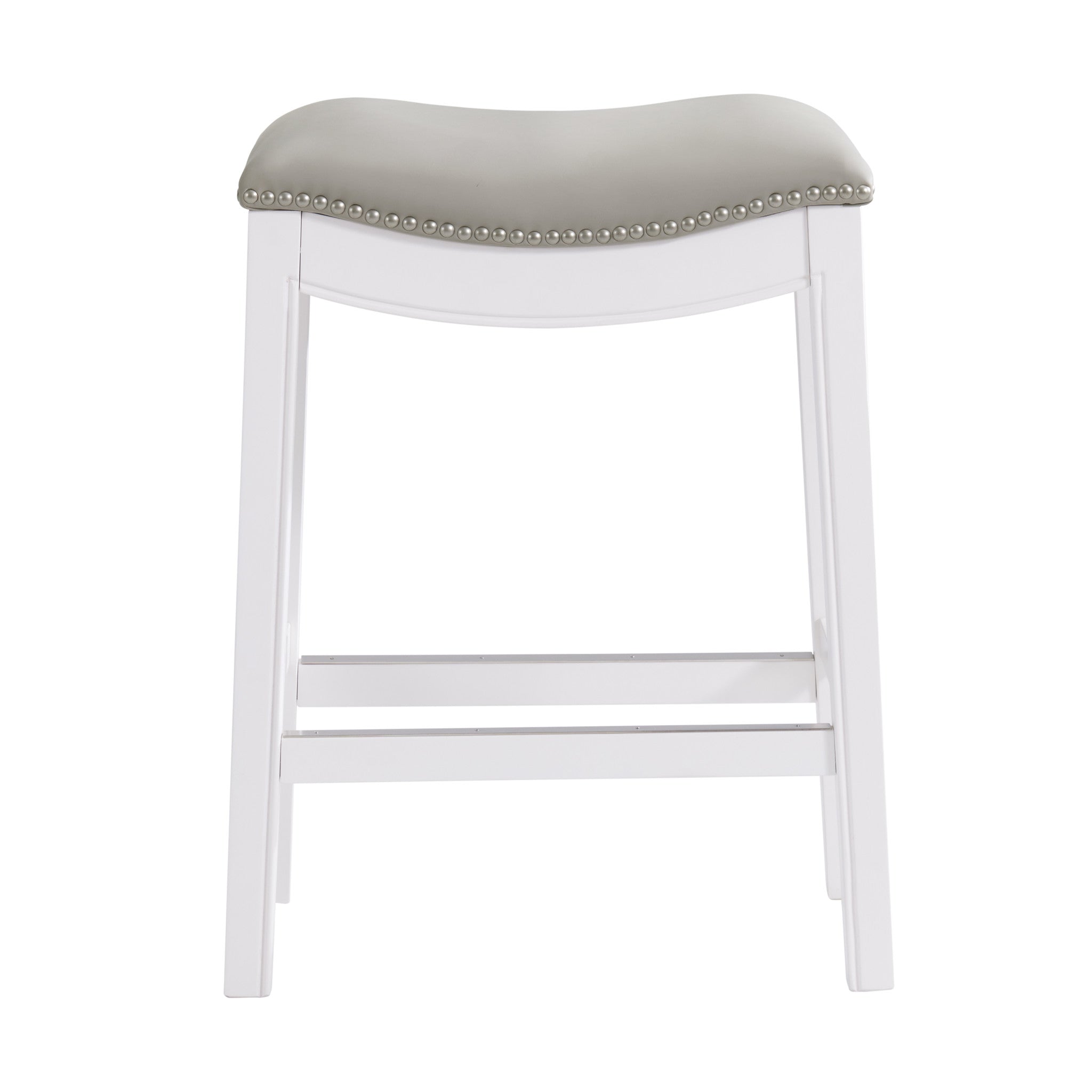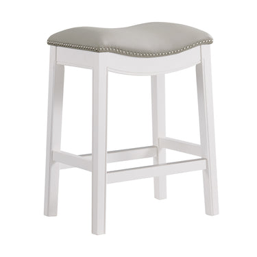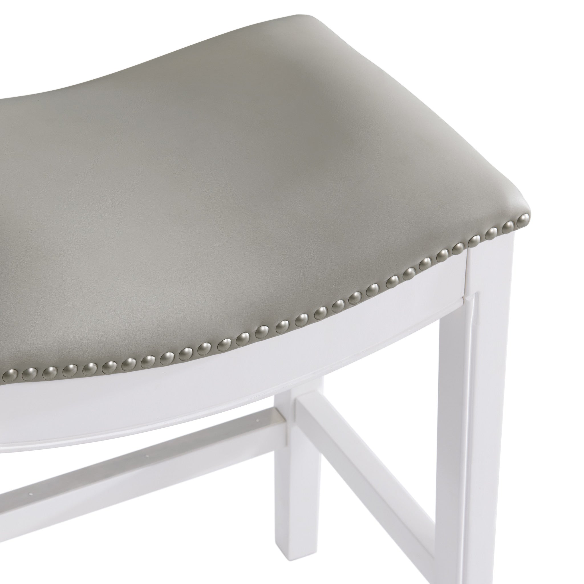 - MODERN DESIGN & SADDLE SEAT COMFORT – Crafted with a solid rubberwood frame finished in crisp white, this counter height stool features a stylish backless saddle seat upholstered in soft, light gray faux leather with silver satin nailhead trim — combining sleek design with exceptional comfort for your kitchen, bar, or dining space.